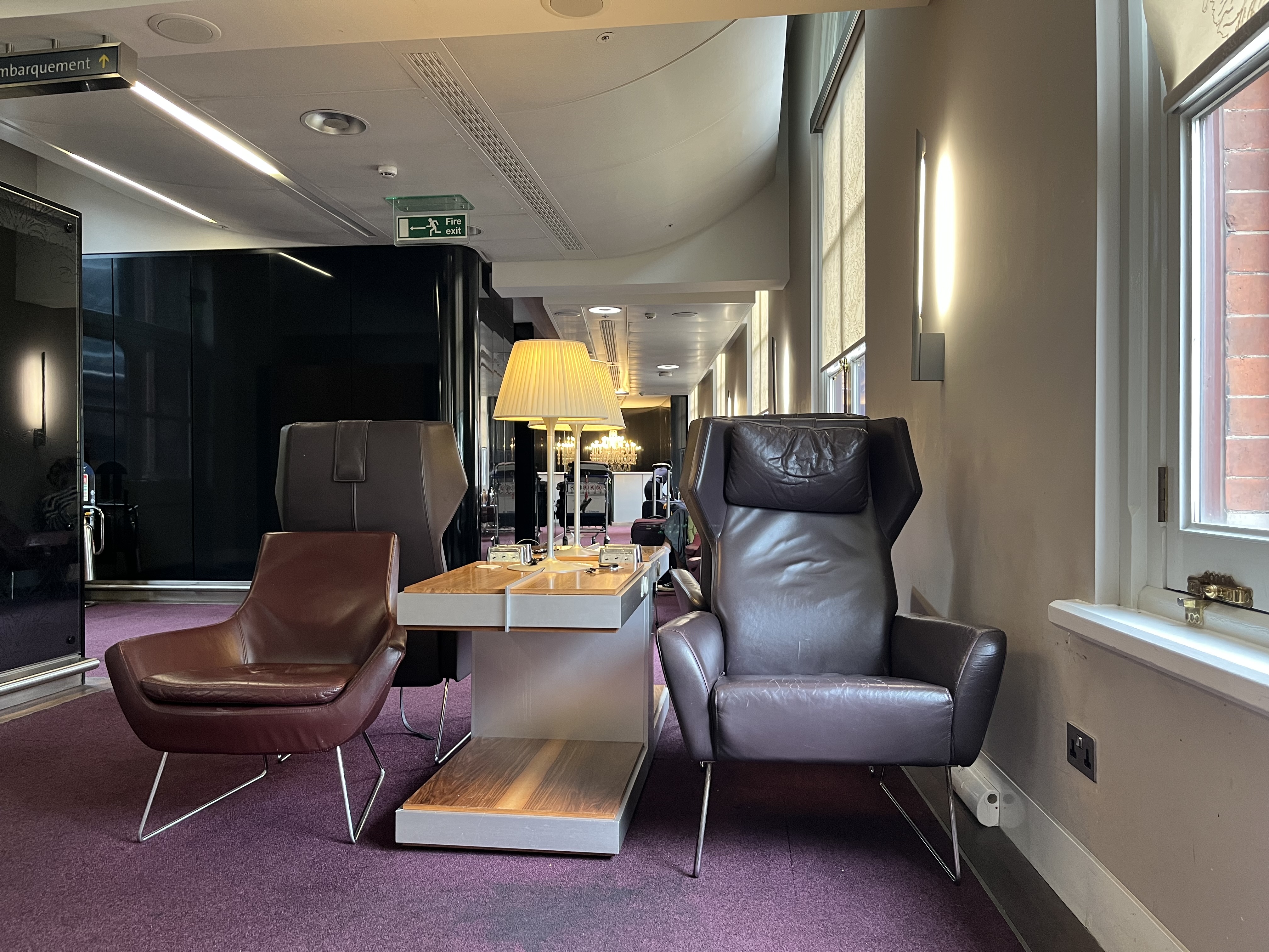 Pictured below is the lounge at London St Pancras, offering complimentary alcoholic and soft drinks and snacks, UK and French newspapers and magazines, and comfortable seating allowing for a space to relax and work prior to the journey. There are two floors with the stairs accessing the more relaxing, quieter upper floor, on the far left hand side on entry.