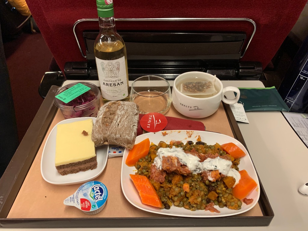 On Thalys 🔴 a similar tray meal is provided on trains designated as lunch and evening meal in the timetable. This includes wine, beer and soft drinks, a salad starter, a cold main course and dessert as pictured below. This is served with tea/coffee with an option of herbal teas. For services departing between meal times, the full meal is not served – only a complimentary snack is provided which is shown as ‘Café Gourmet’ in the timetable.