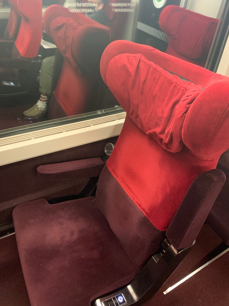 Seating in the most premium class on both Eurostar 🔵 and Thalys 🔴 trains is in a 2+1 configuration with a mixture of tables for one, two and four travellers available. Seat reclining is possible on both services and a table – specifically a seat back tray table on solo and this is a fixed table or tray table. Power sockets are available at every seat with complimentary WiFi. Thalys trains have more padded seating than Eurostar, which I did find more comfortable.