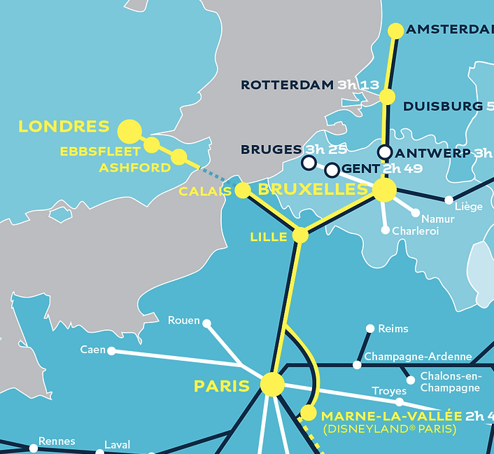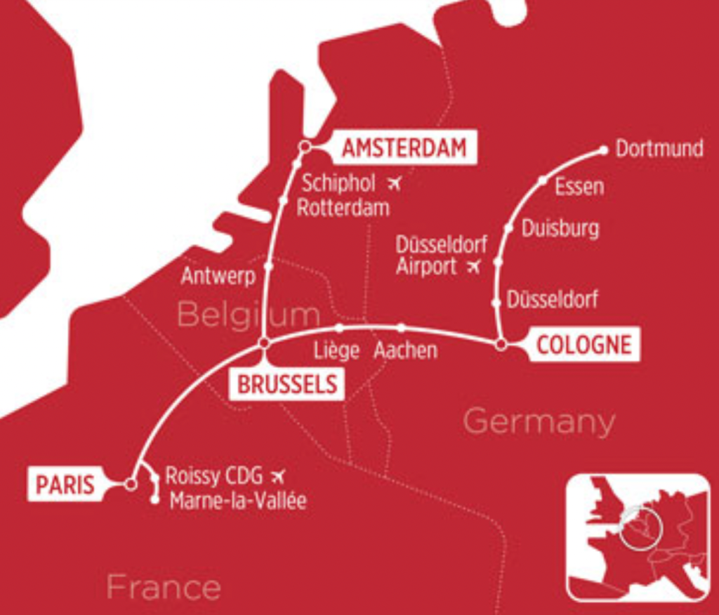 Eurostar 🔵 trains run through the Channel Tunnel, connecting the United Kingdom (UK) with France, Belgium and the Netherlands; while Thalys 🔴 trains connect France, Belgium, the Netherlands and Germany. The only market that is served by both Eurostar and Thalys is Brussels to Amsterdam, although availability is often limited / non-existent with Eurostar for this journey and no fares exist at all available for Business Premier – only for Standard and Standard Premier classes.