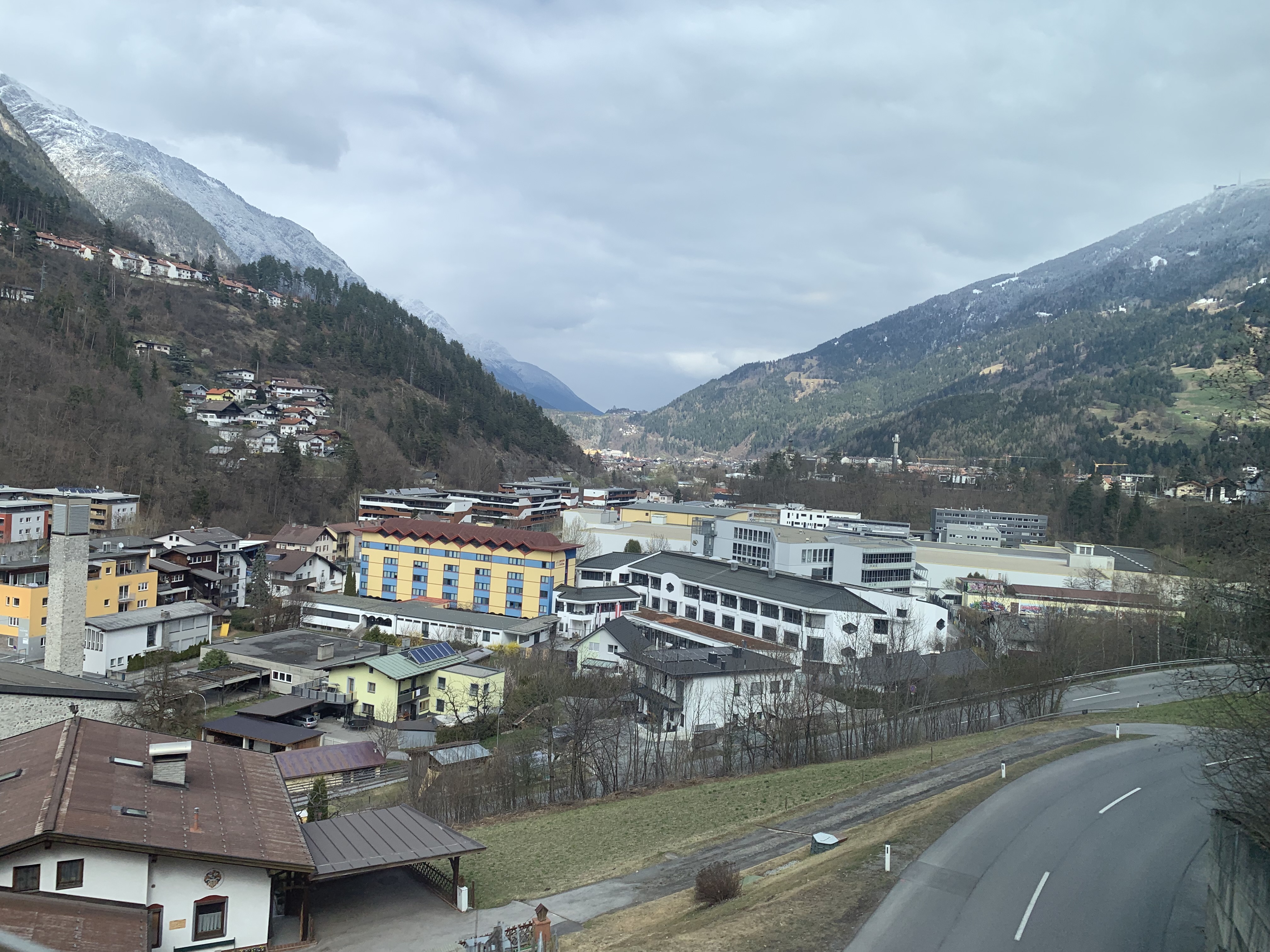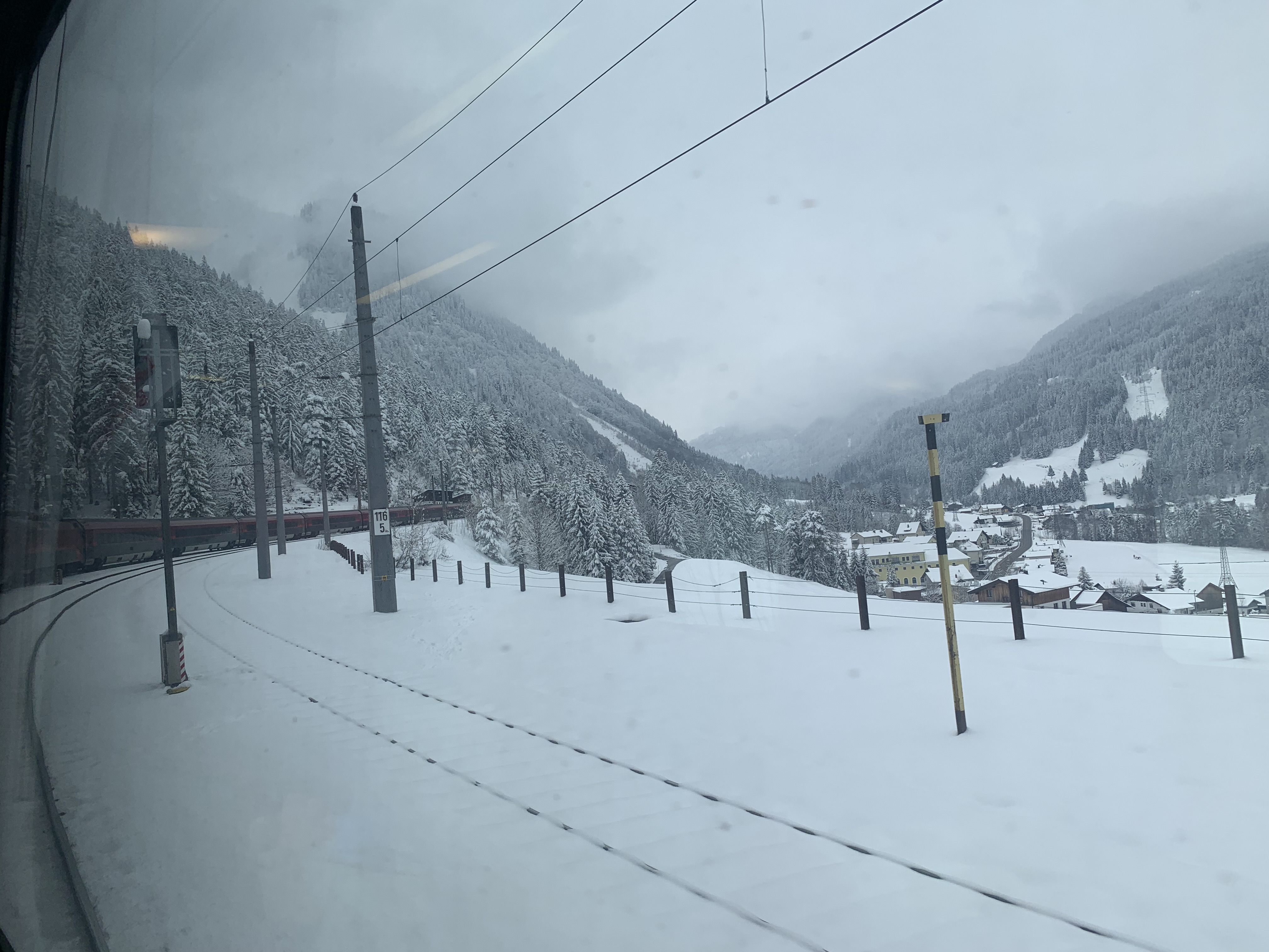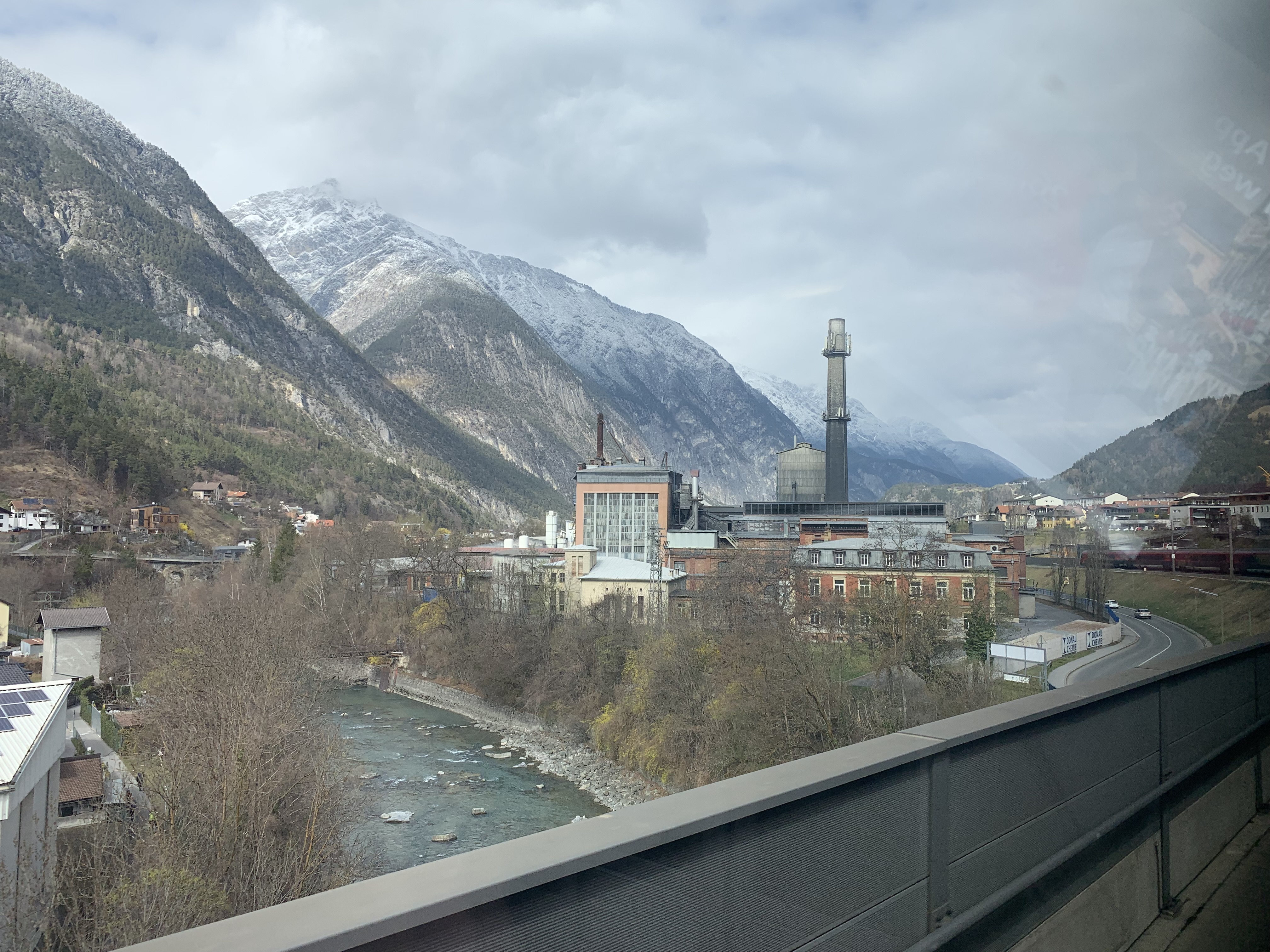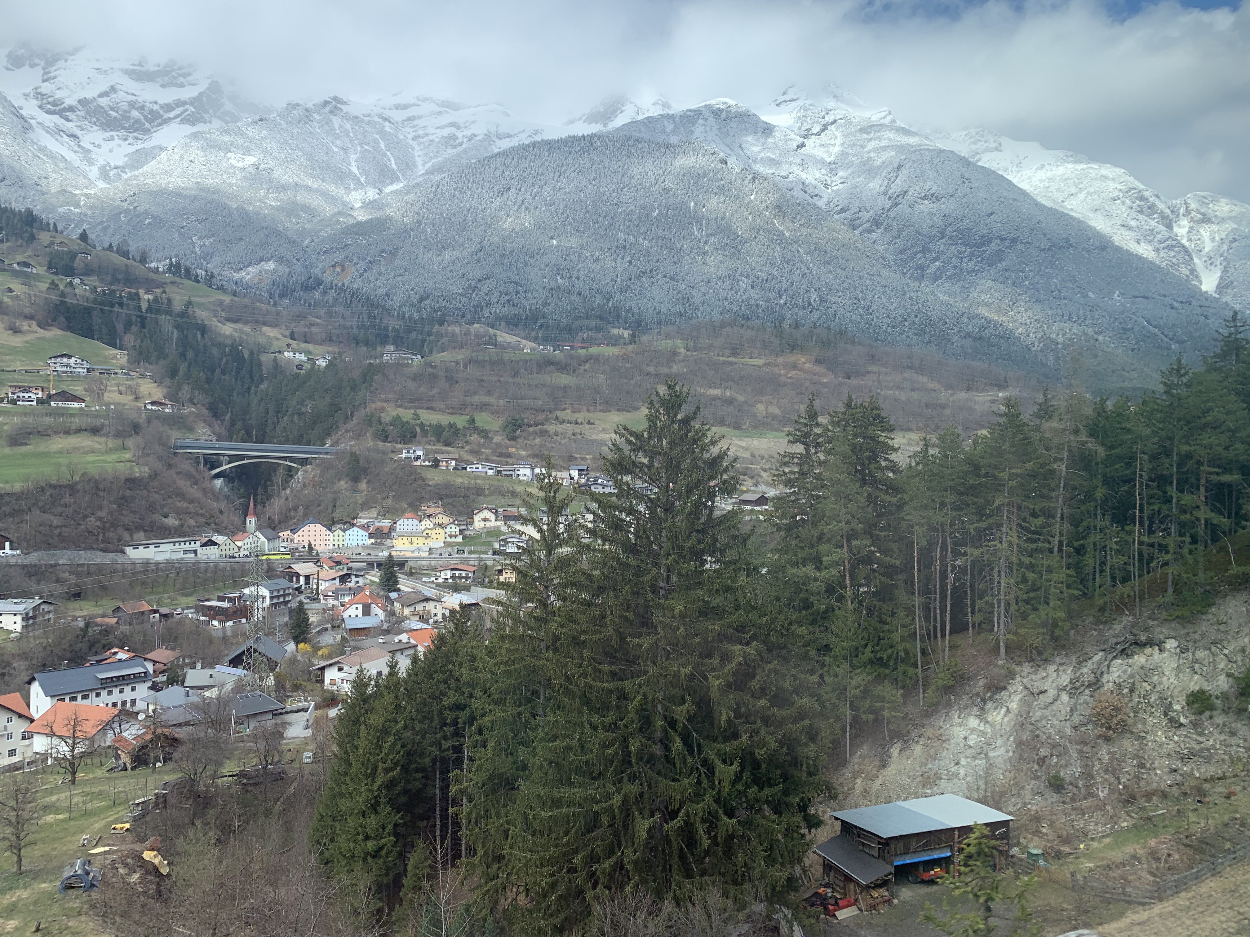 The dramatic scenery on this route was a feast for the eyes for most of the journey. On departure from Zürich, the train runs along two lakes, Zürichsee and Walensee, before starting the ascent to the stunning Arlberg Pass, reaching a modest 1,310 metres above sea level. To add to the magic, in April time there were snowy landscapes thrown in. The snow on the ground increased as the train reached the highest part of the line, then the train travels through the short Arlberg Tunnel before descending into Innsbruck, and eventually Salzburg and Vienna.