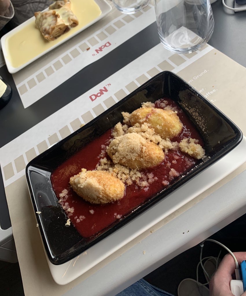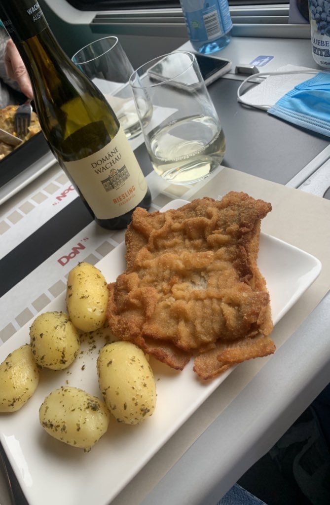 As mentioned already there is a Dining Car on the RailJet train situated between Economy Class and First Class. This is open to all customers, however, there is little reason in moving to sit here from the comfort of a First Class or Business Class seat with the at-seat service provided. The menu isn’t the cheapest, but the food very enjoyable. I enjoyed a Wiener Schnitzel for mains, followed by Griesflammerie for dessert and all washed down with a very good bottle of Reisling – this set me back a total of 31,20€. Highlights from the menu are pictured below.