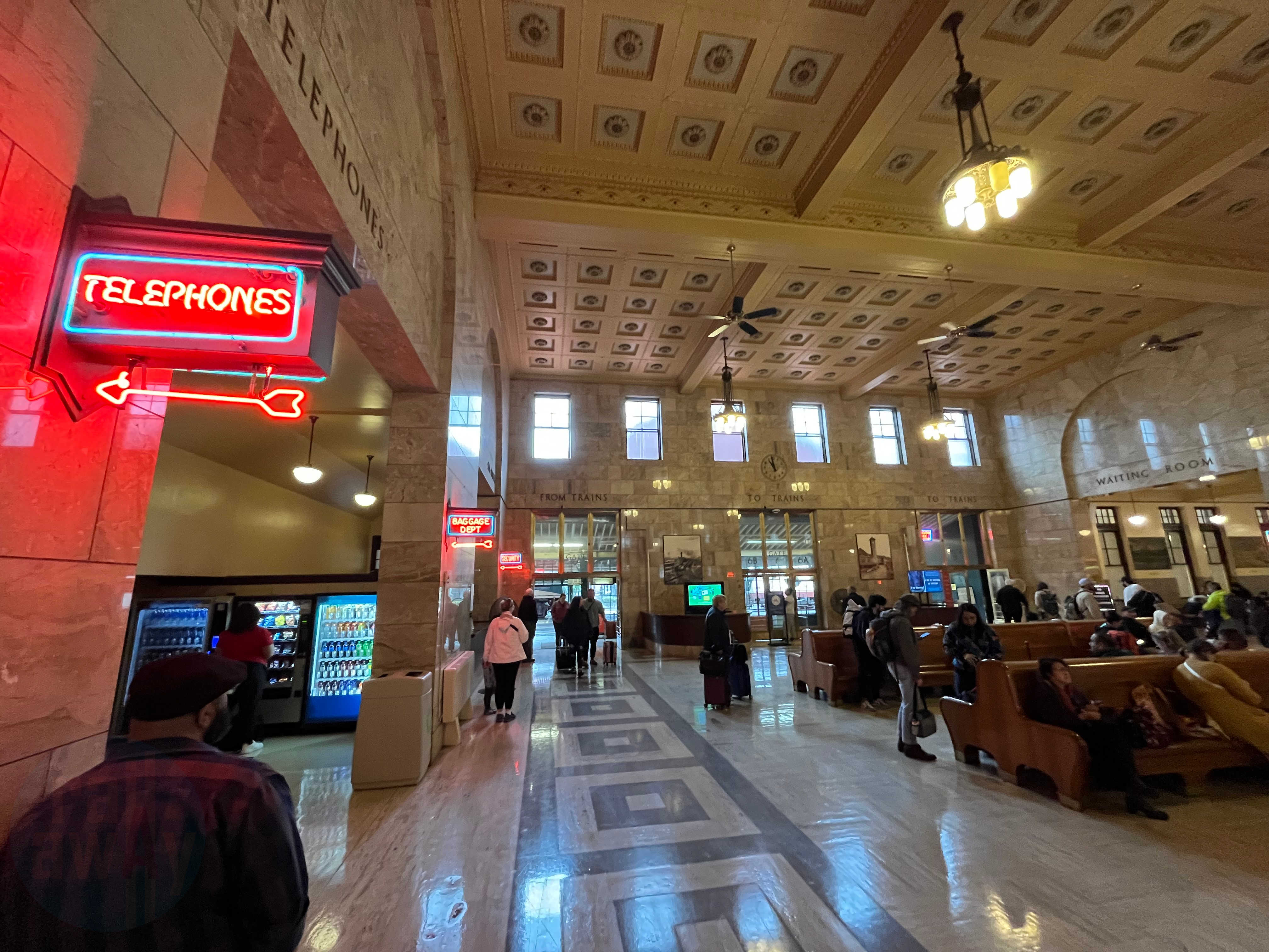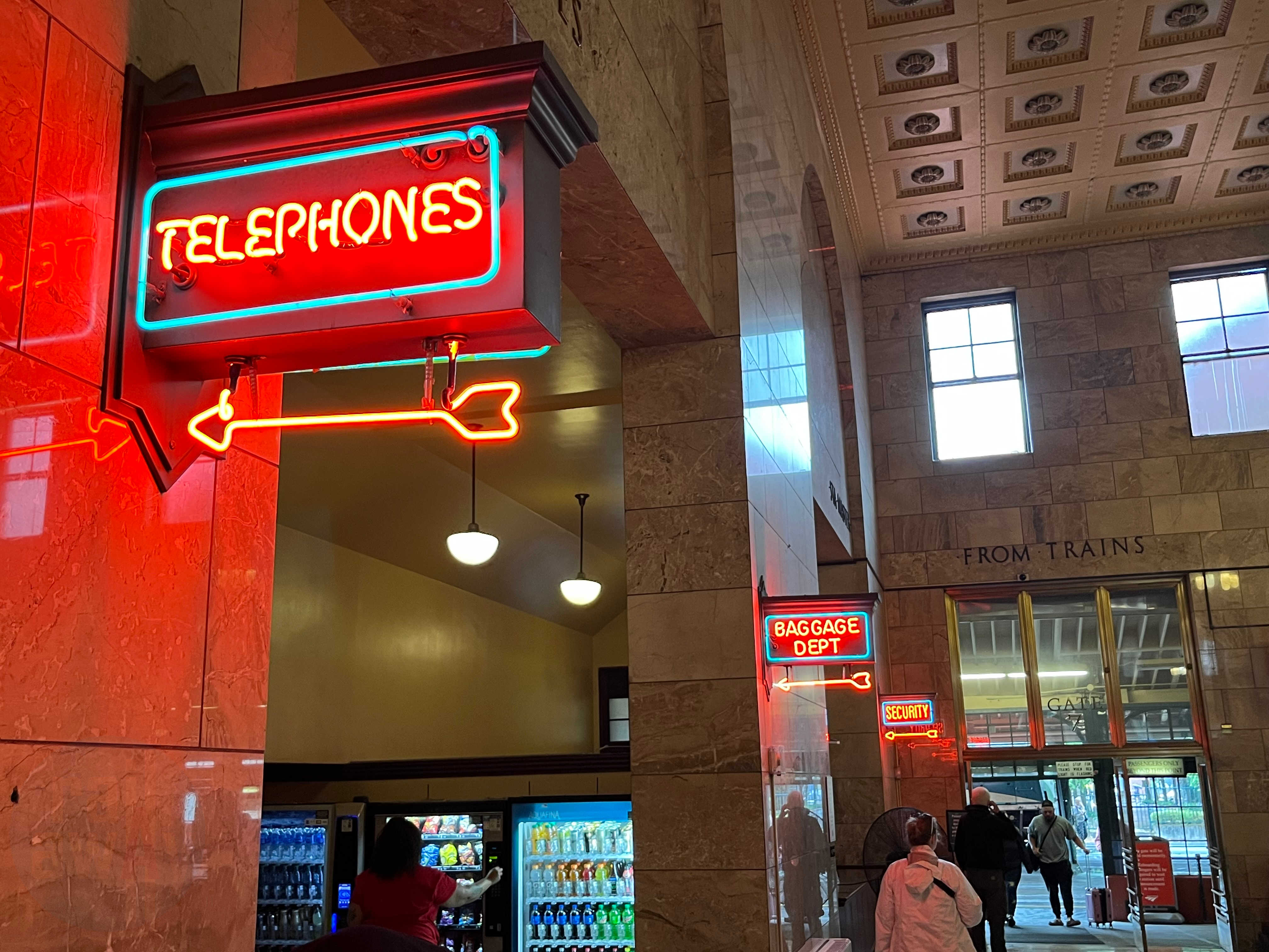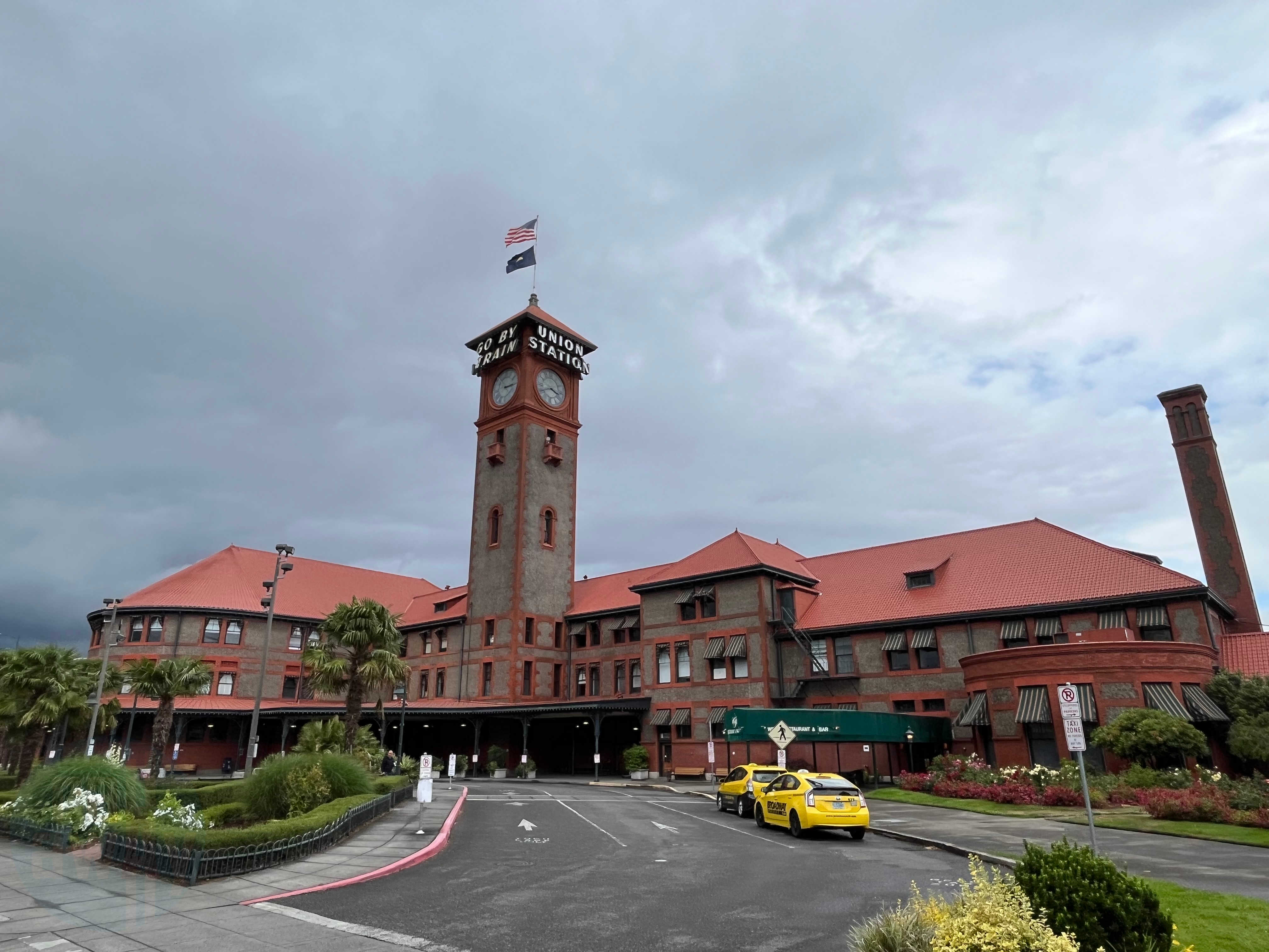At first glance, Portland’s Union Station may be mistaken for a hotel with its dressed windows and pitched roof. As soon as you glance up at the tower, however, you’ll know you’re in the right place with “Go By Train” in a wonderfully bold, italic font. Inside the station, you’re presented with the grandeur of the 1896 building with the more recent addition of bright, neon signs telling you where to find the telephones, baggage dept and the security office.