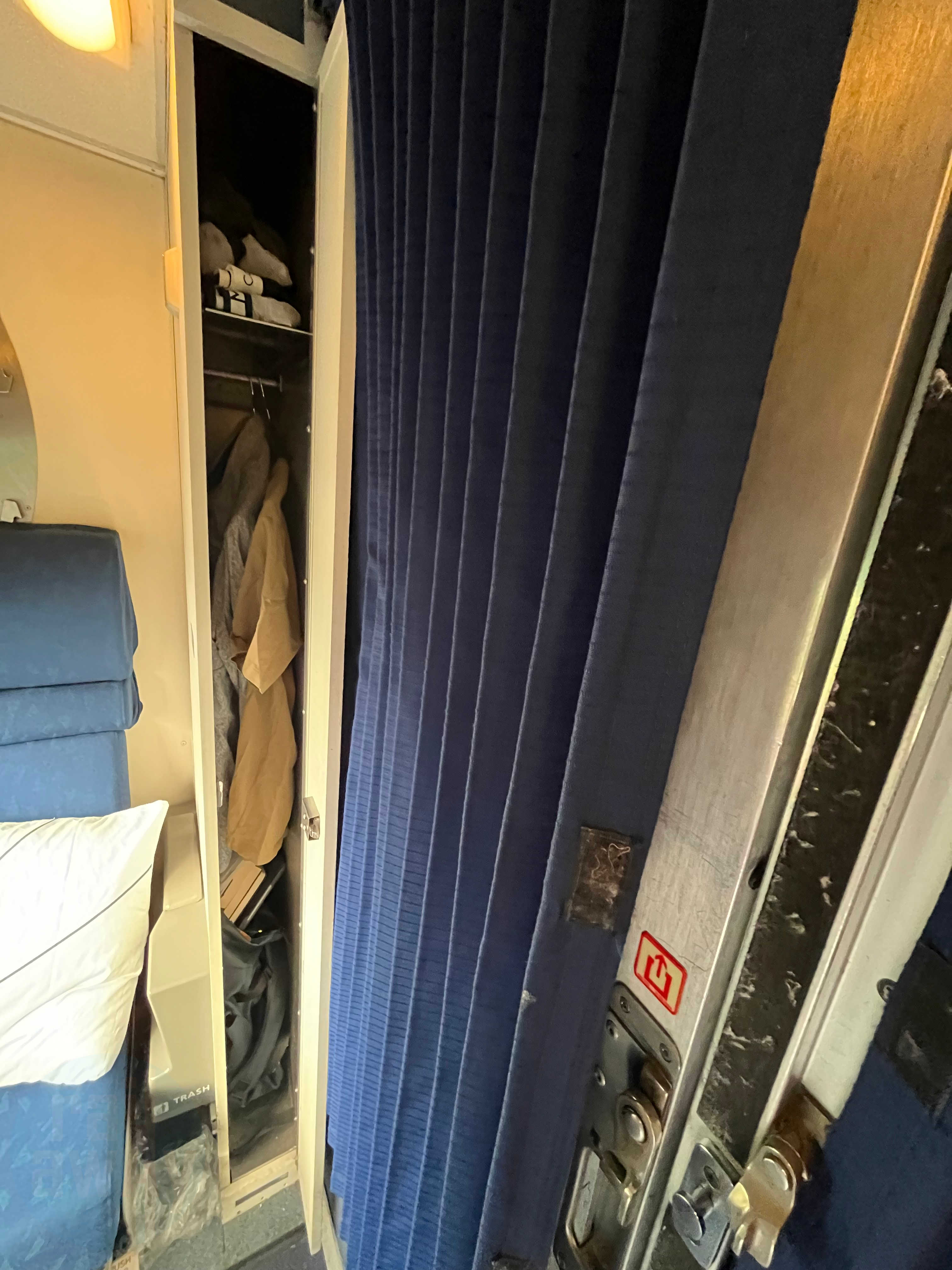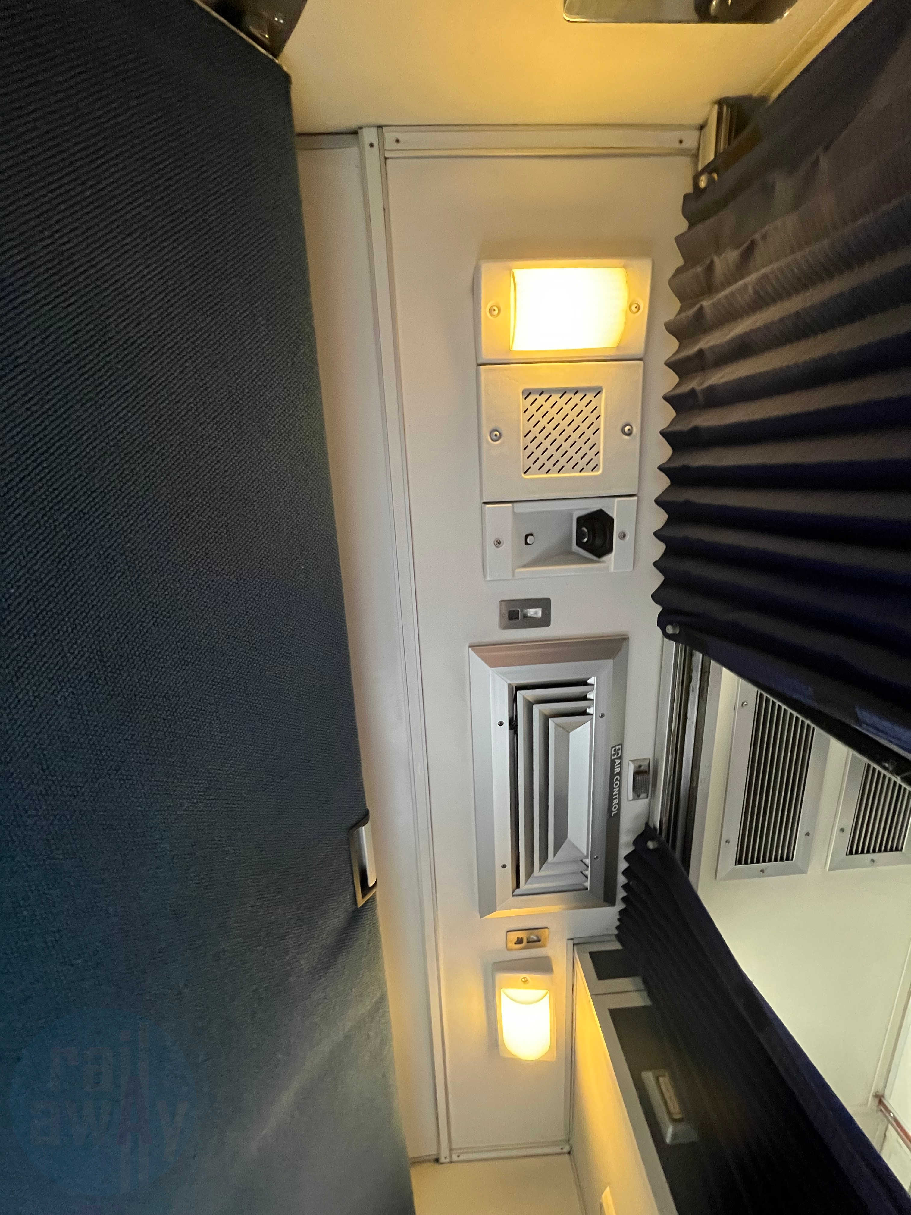 Superliner Roomettes are available in one half of the sleeping car, both upstairs and downstairs. Each compartment accommodates up to two passengers on bunk beds – one is converted from the two facing seats, the other folds down from the ceiling. The use of space in the roomette is really neat and that goes for the wardrobe too – though this has to be a contender for the narrowest in the world.