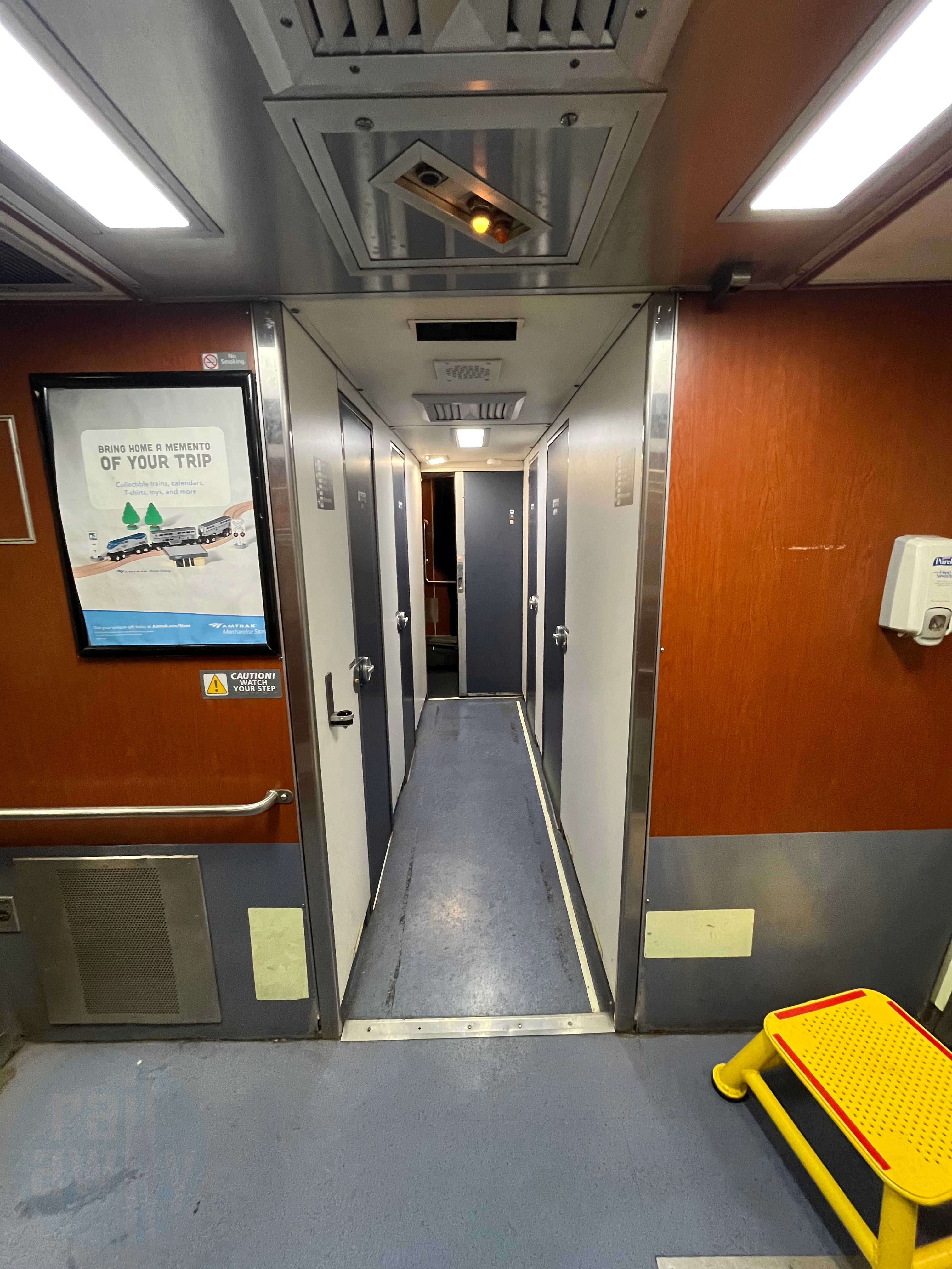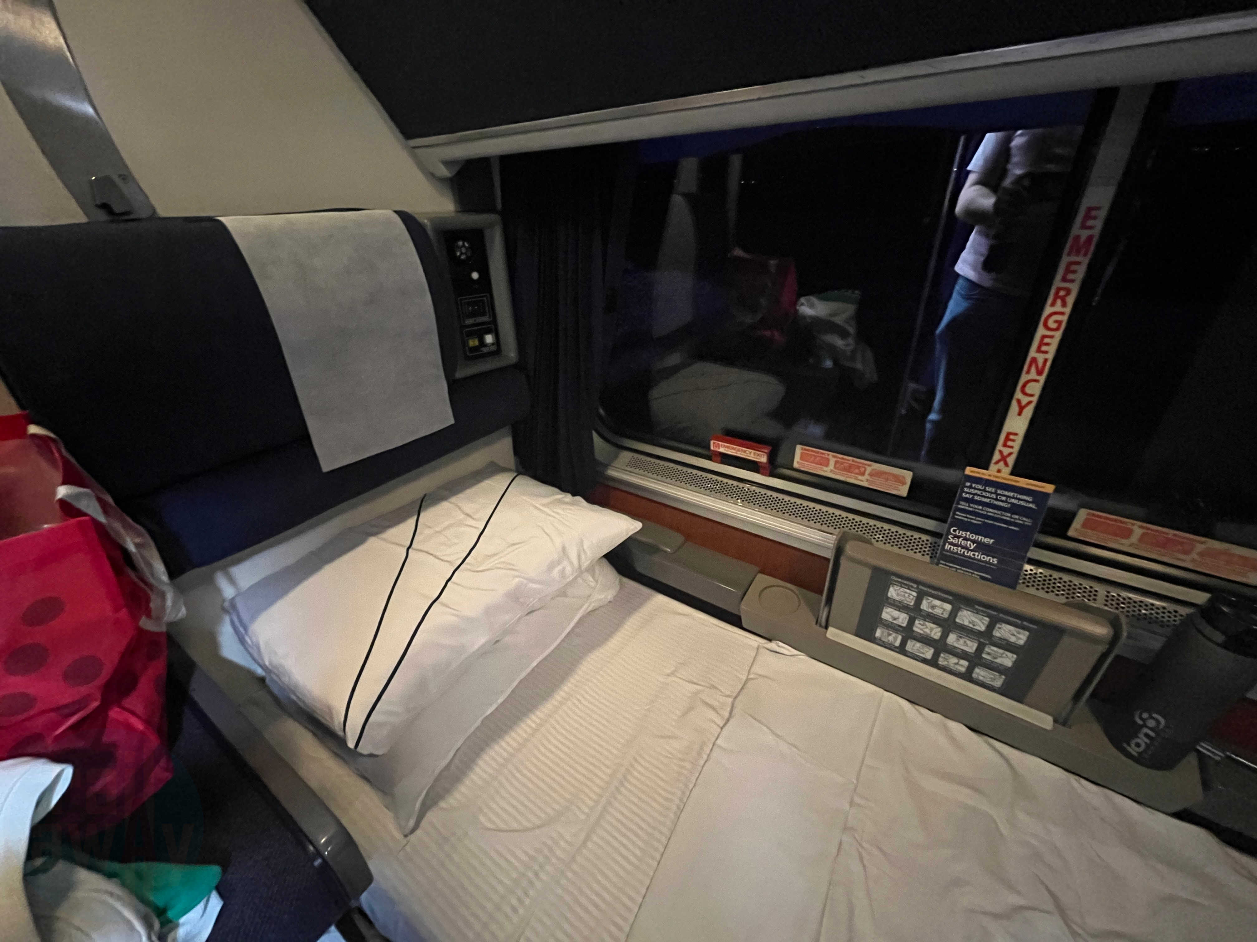 The most premium accommodation on Amtrak is the Bedroom. There are five Bedrooms on the upper level (rooms A-E) and each one accommodates up to three people – one single bed that folds down and a lower bed converts into an almost double bed. I’ve heard that’s very tight. There is also an accessible bedroom, room H, and family bedroom, room 15, on the lower level.