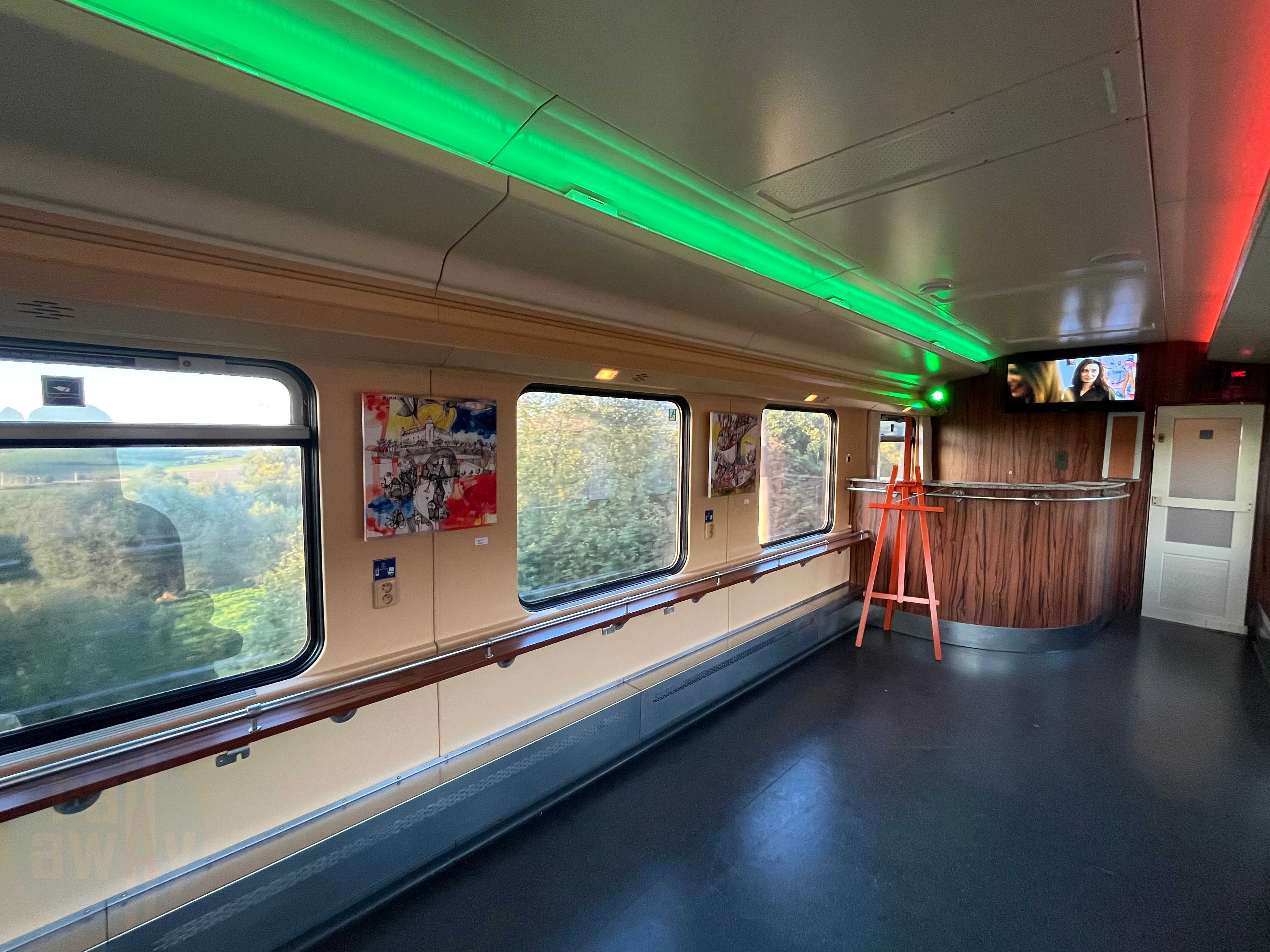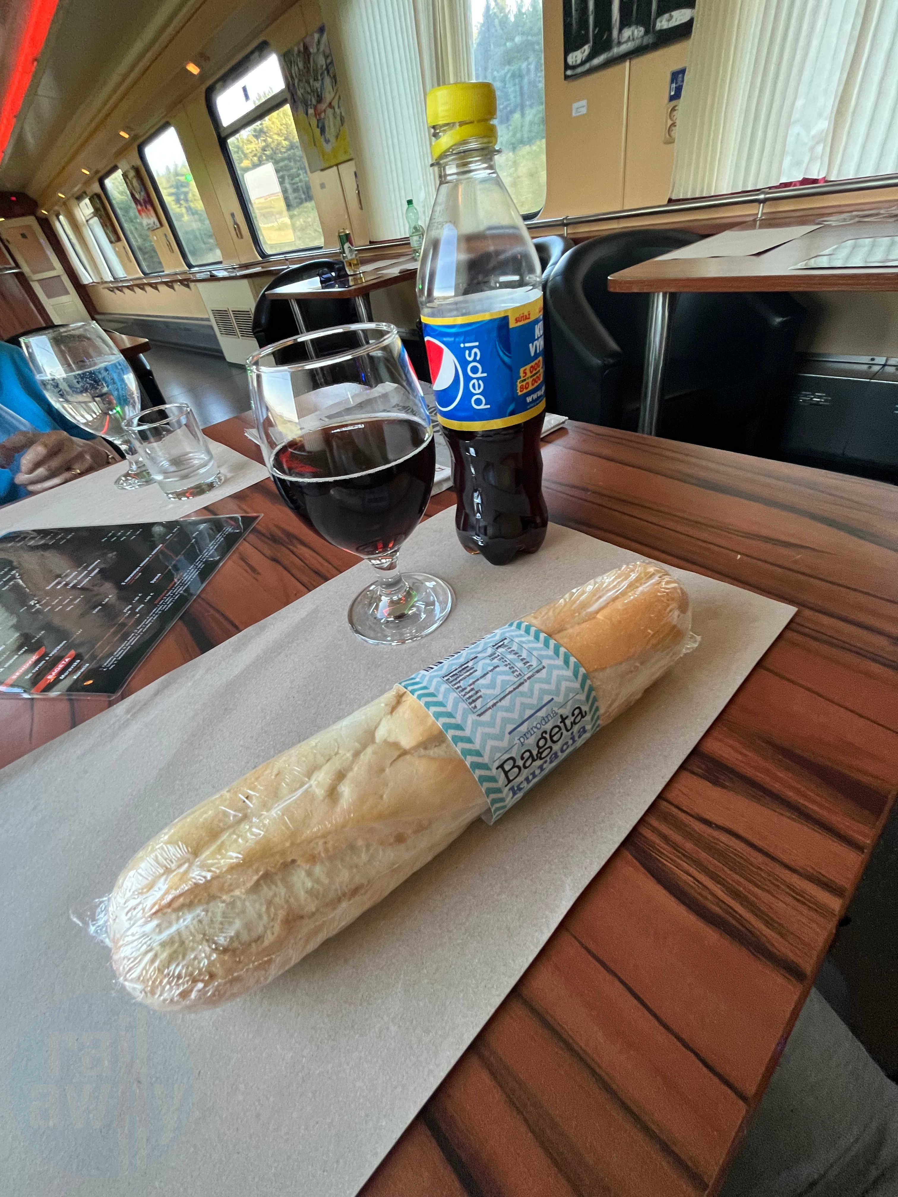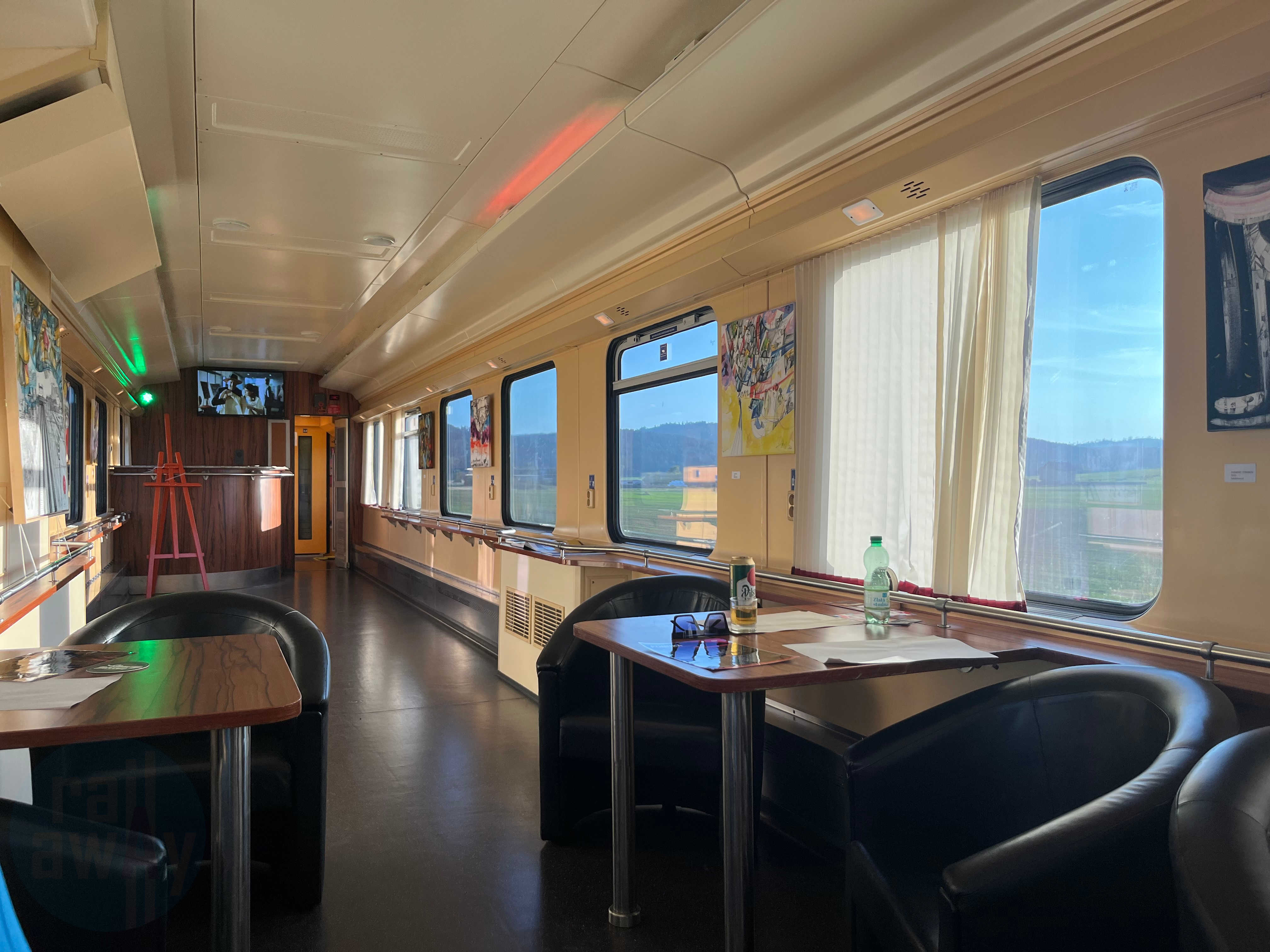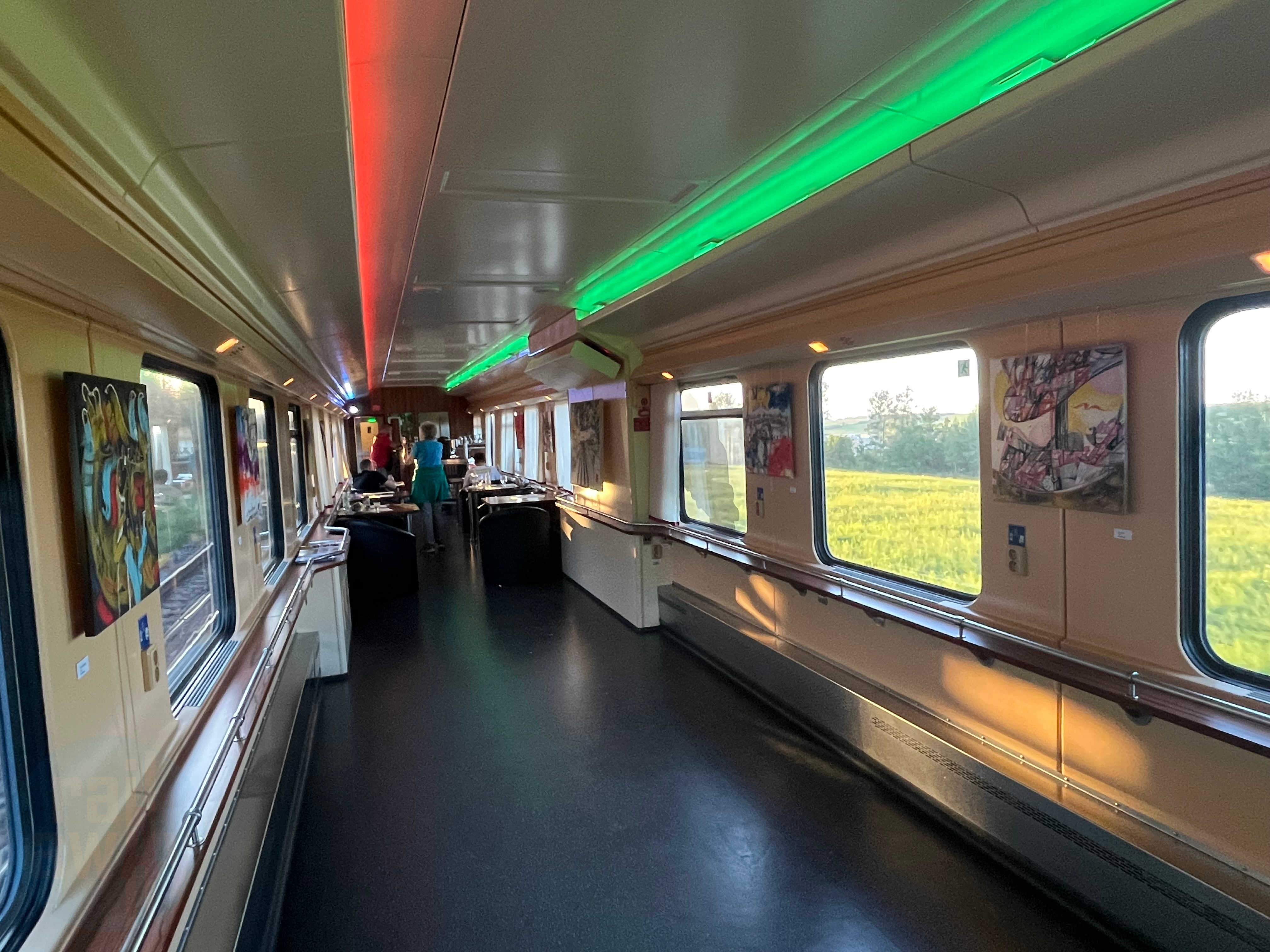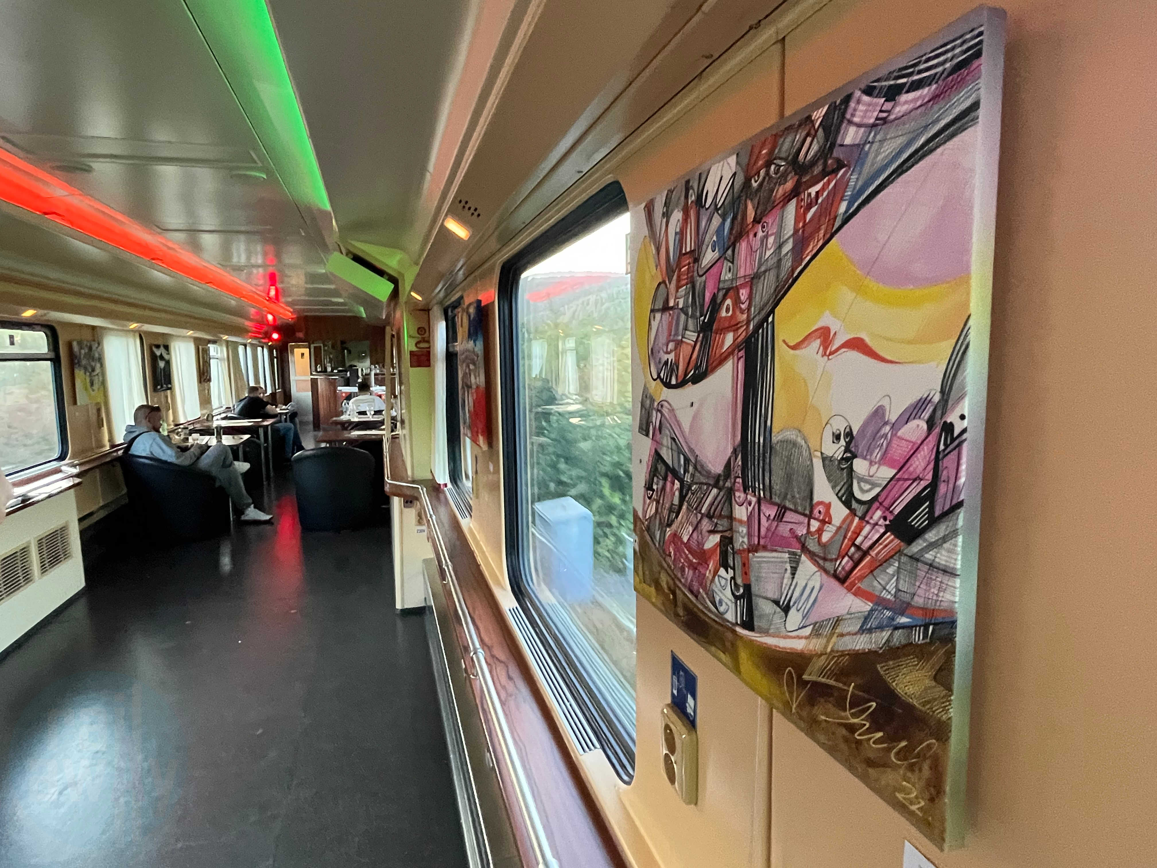 At the time of travelling, the most unique of all the Dining Cars is the “WGmeer” type. Normally used as a carriage that can be booked for special events, e.g. conferences, but used as a fill-in Dining Car. This has been recently taken over as an art gallery showcasing the work of visual artist Luka Brase for ZSSK’s 175th anniversary! An art gallery on a train must be a first, surely? I really liked the concept, which made up for the fact that it did have a reduced menu in place compared to the regular Dining Cars on this route – only sandwiches and drinks were available.