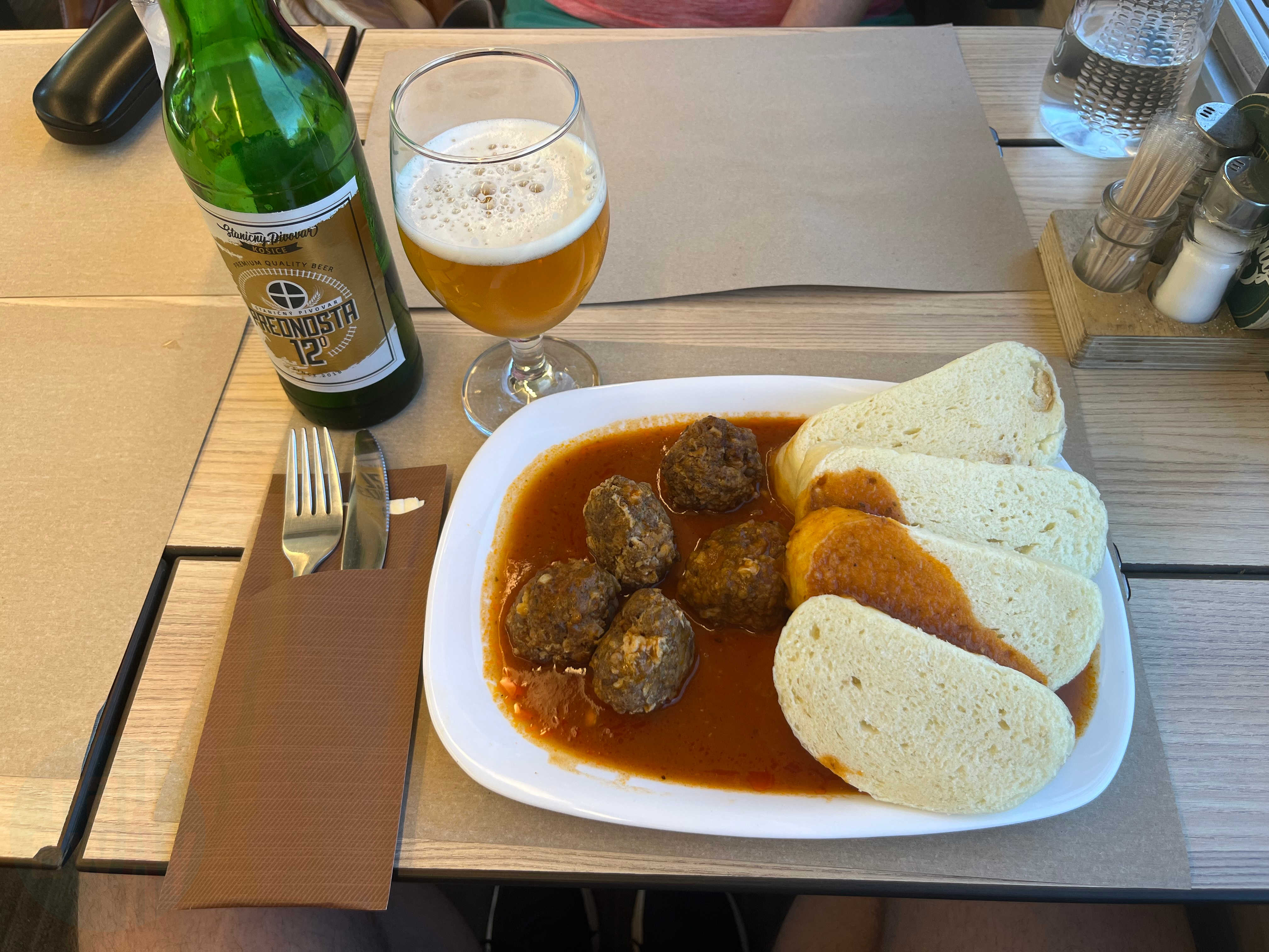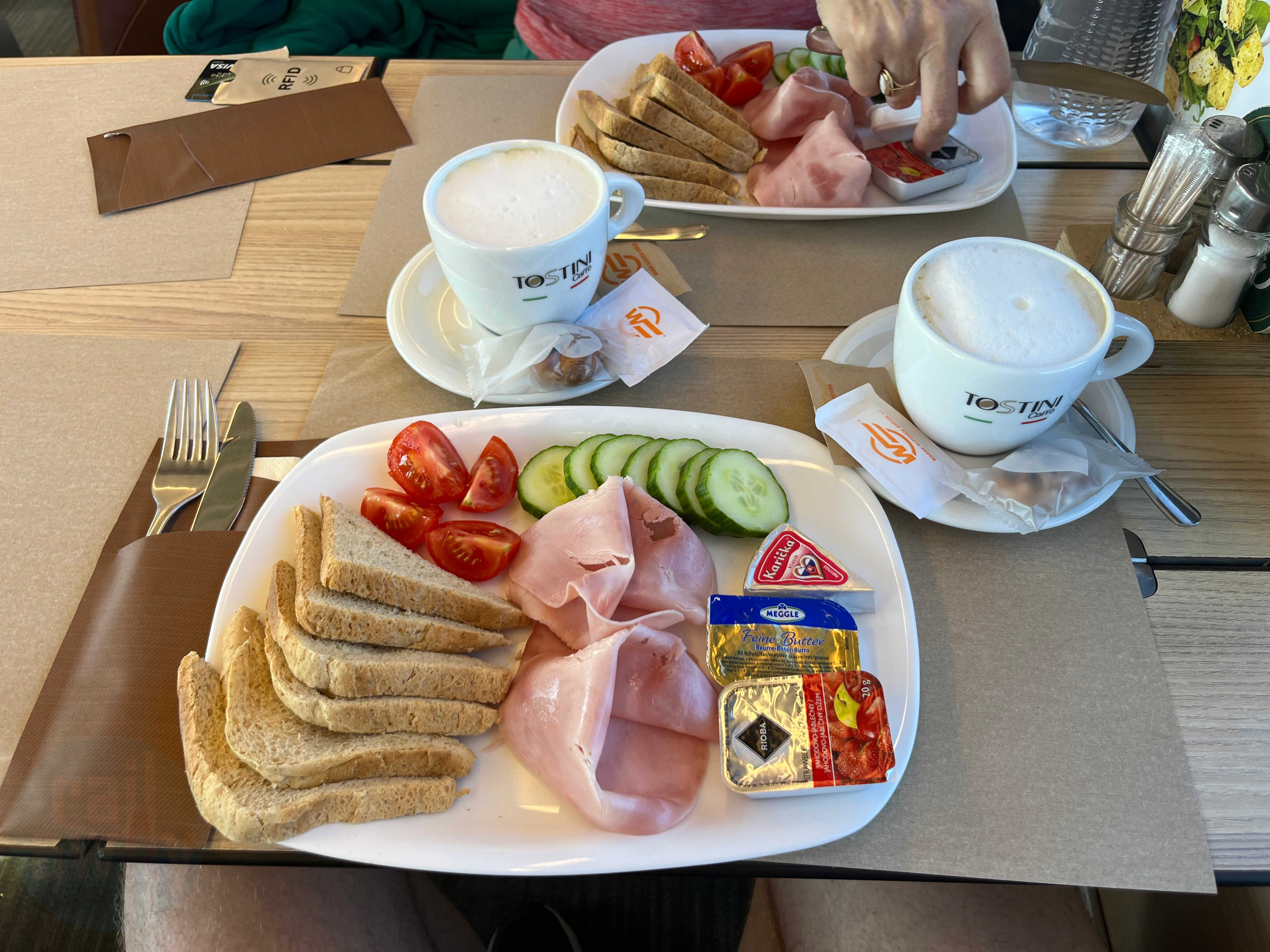 The first one is a “WRmz” type and was recently modernised and re-launched in 2021 featuring leather seats and a more modern ambiance. The air conditioning was slow to get going on this one since leaving Bratislava, so staying for breakfast in the name of ‘research’ was a challenge, though we could have taken this away in a box if we wanted to. Thankfully, when we had returned for lunch it had considerably cooled down. For breakfast, I opted for the ham salad. For lunch I opted for the delicious Maďarský guláš, or Hungarian goulash, with steamed dumplings and a beer followed by Marlenka, or honey cake.