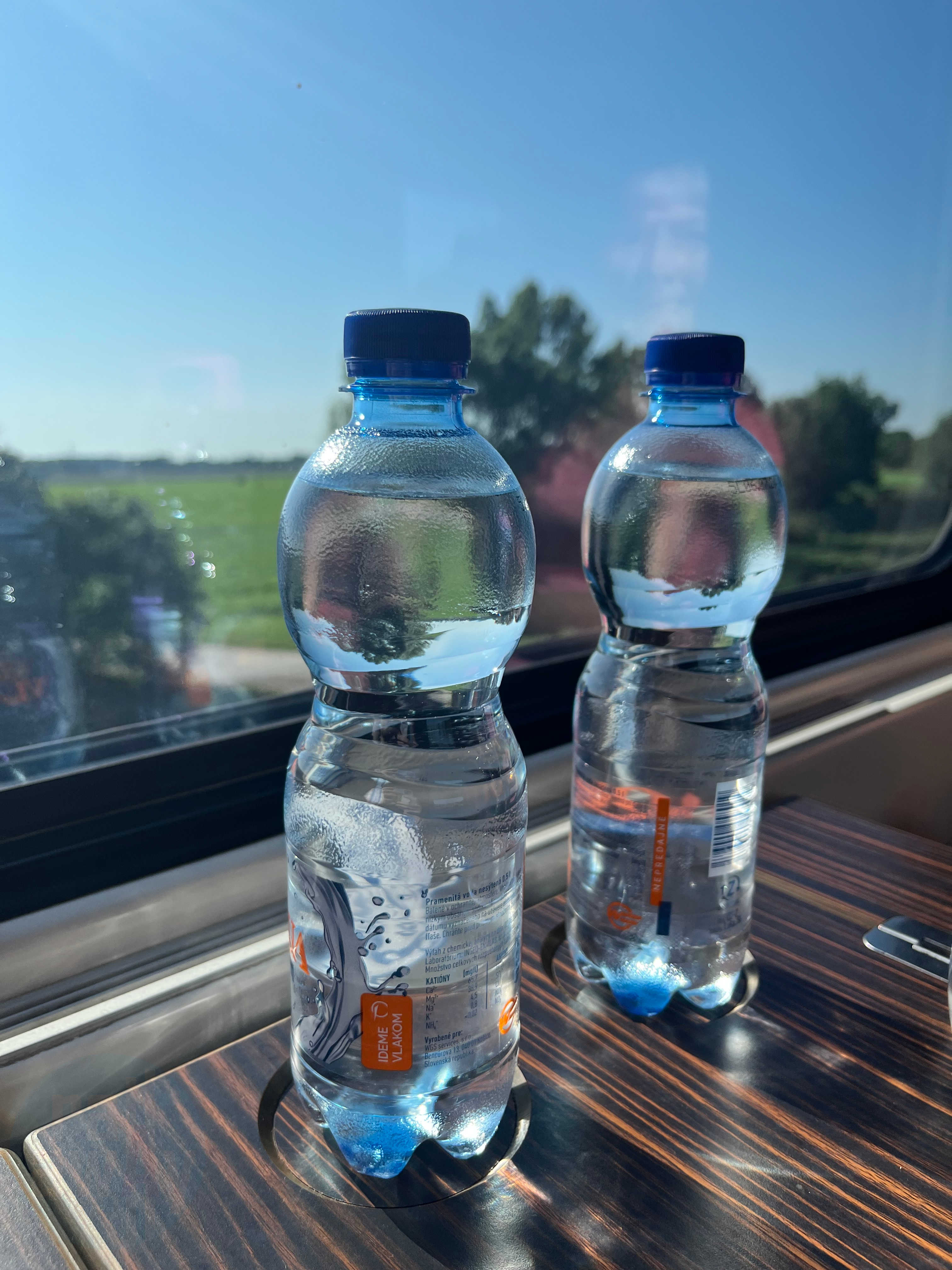 In common with trains in Czechia, once the Slovakian conductor had come around to check our tickets, a complimentary bottle of still water was handed out to First Class passengers. I struck lucky on this trip as I ended up with not one but two bottles – either the conductor thought the previous person had left an empty bottle or I looked thirsty, which was accurate having walked in the hot Slovakian sunshine from Bratislava’s old town.