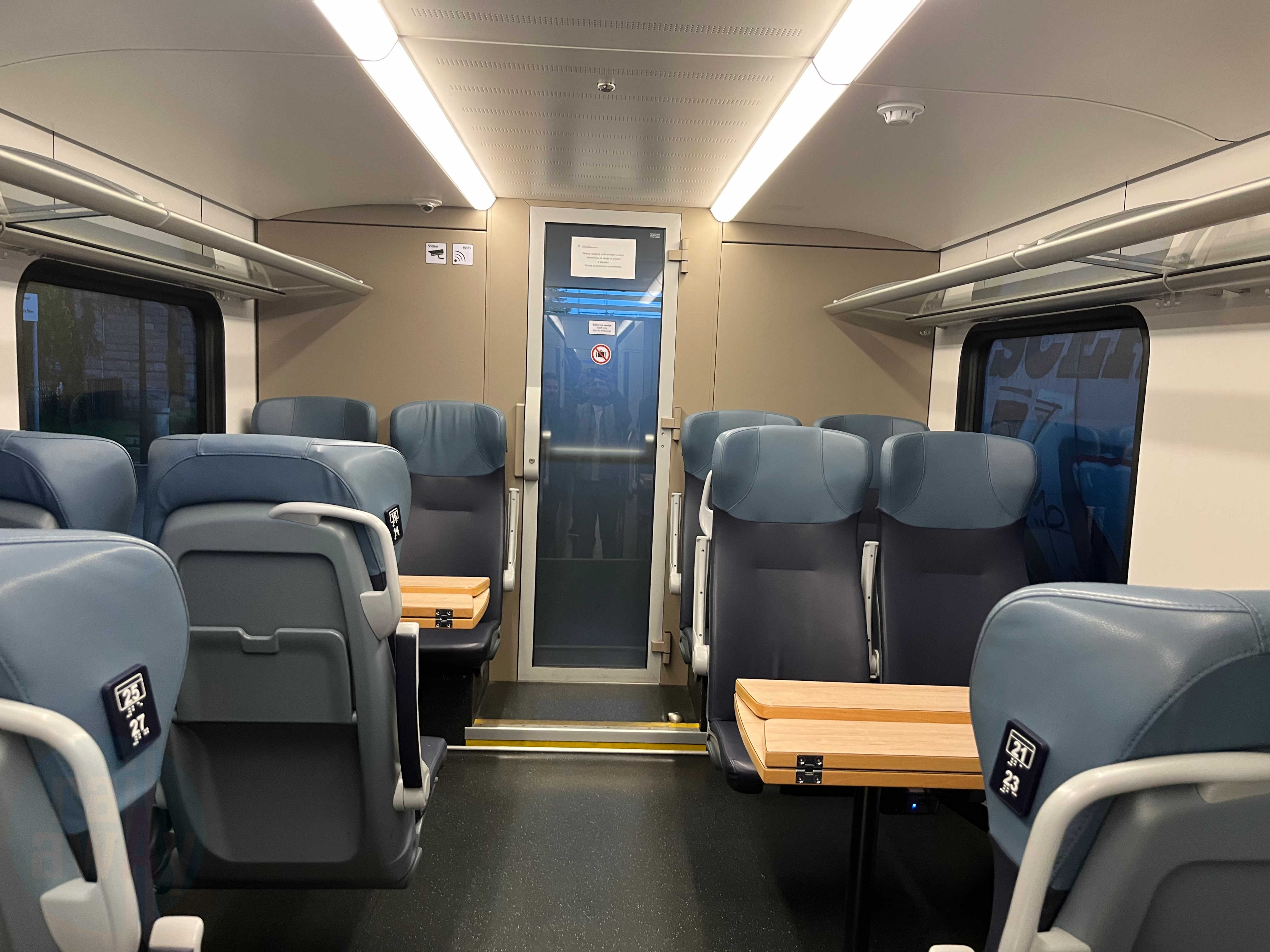 There are 201 Second Class seats on the Slovenske železnice Stadler FLIRT. These comfortable seats are arranged in a 2+2 configuration across the four carriages. Most seats are in an airline-style configuration and some are situated around bays of four.