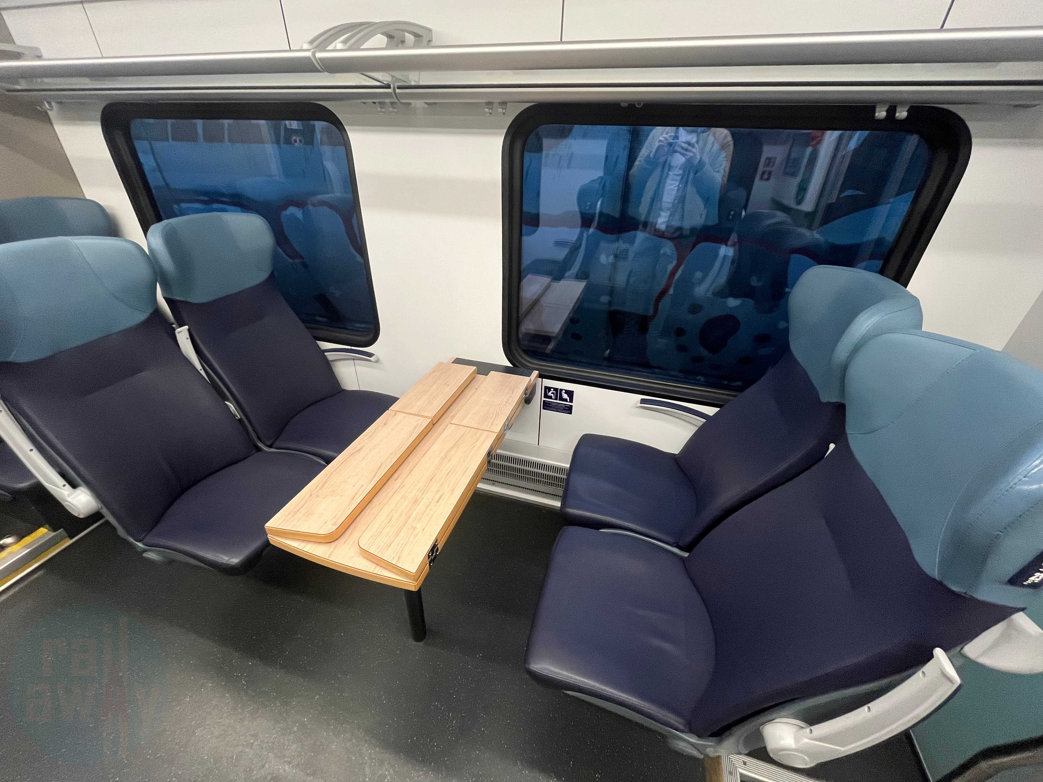 Contrary to Second Class, all seats come with a table of some sort – large fold out tables at tables of four with the airline-style coming with a regular seat-back folding table. As with Second Class, legroom is fantastic. This is the ideal space for working in a hopefully quieter environment.