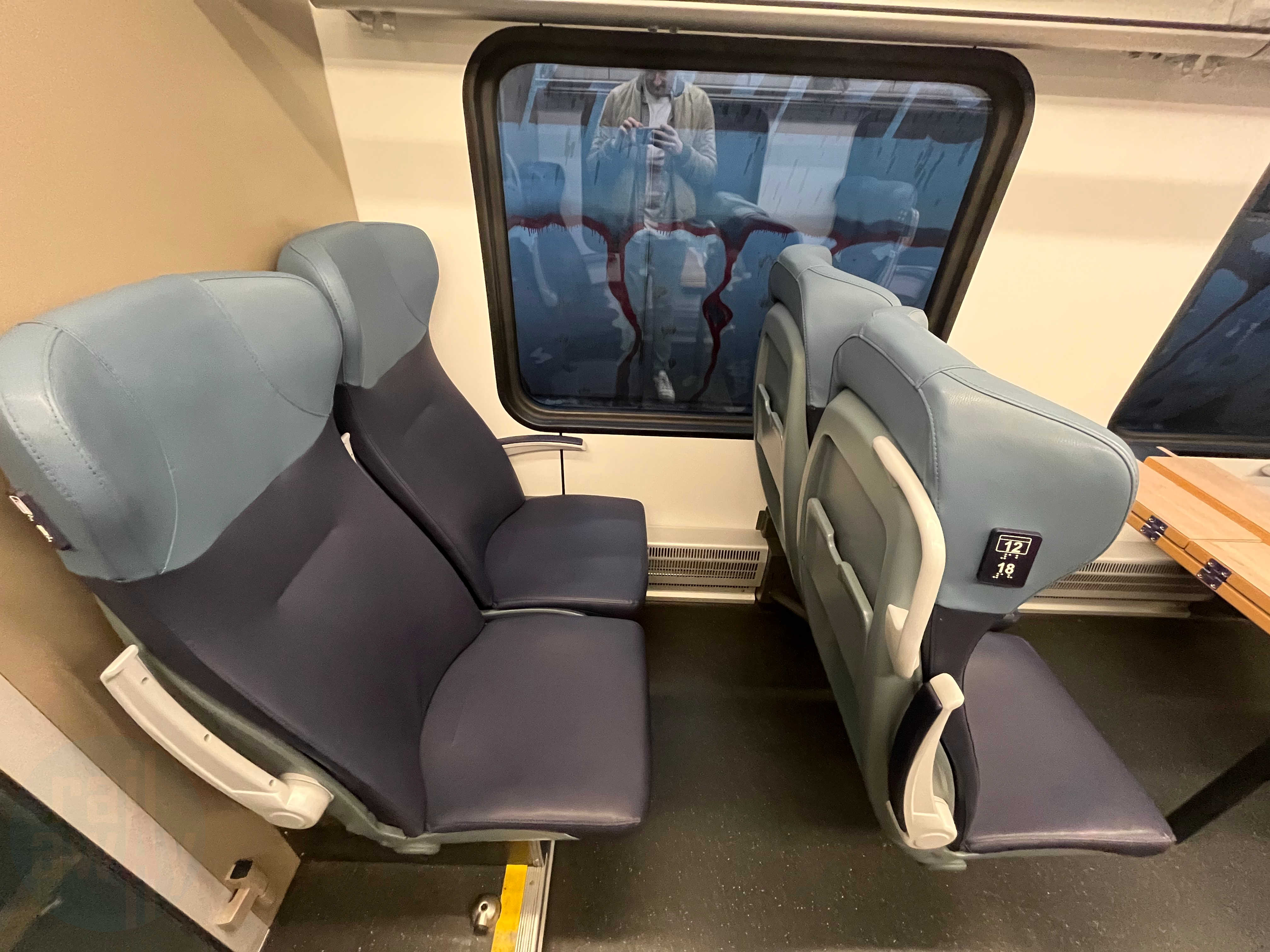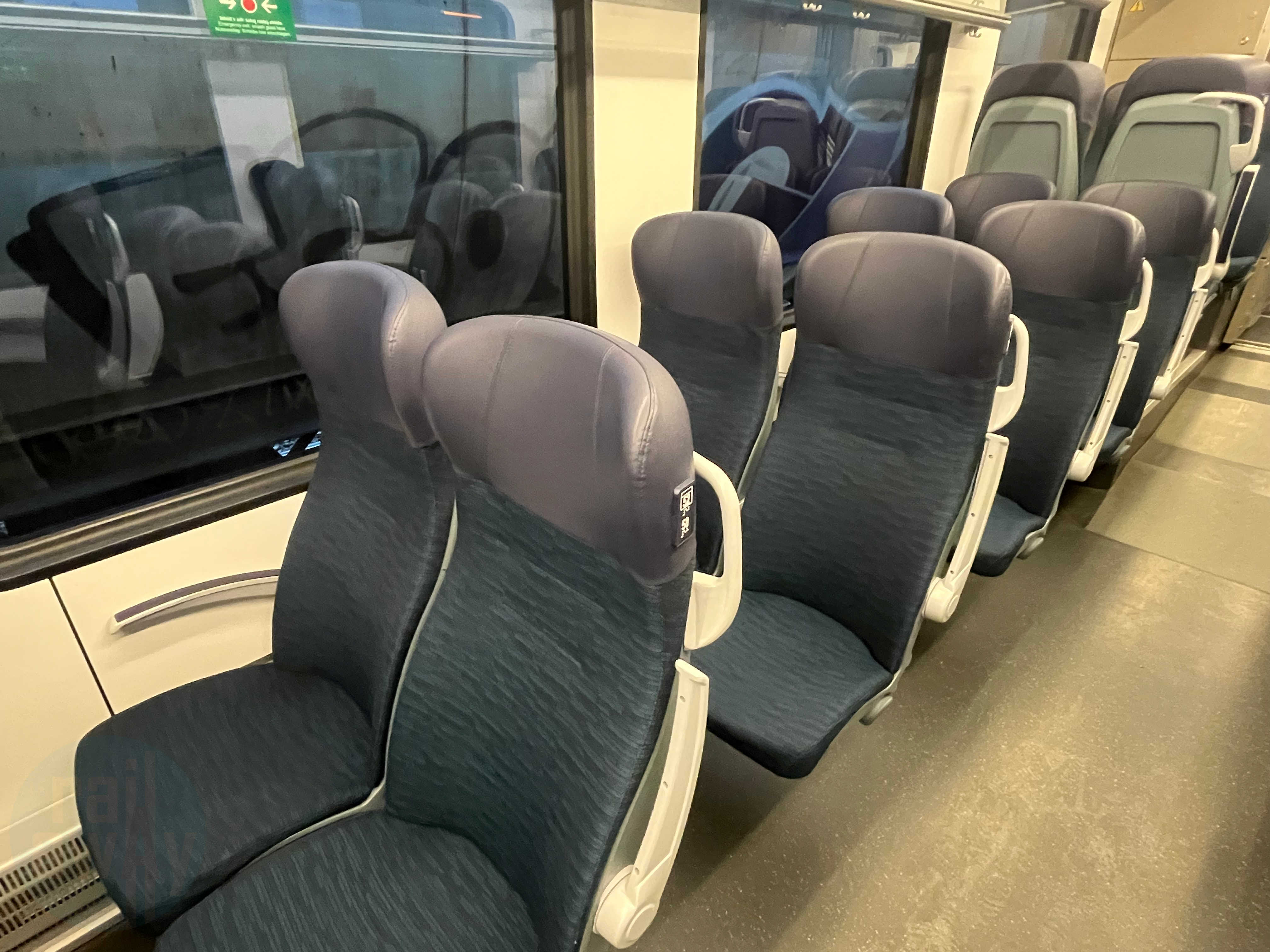 There are twelve seats available at one end of the train in the First Class compartment – separated to the rest of the train with an automatic door. These are arranged in a 2+2 configuration in the same way as Second Class.