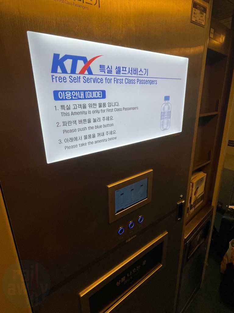 There is also a vending machine with free bottles of water provided for First Class passengers too. This is only available on the KTX-I and therefore is another inconsistency in service compared to the newer versions where water is provided at seat or not at all.