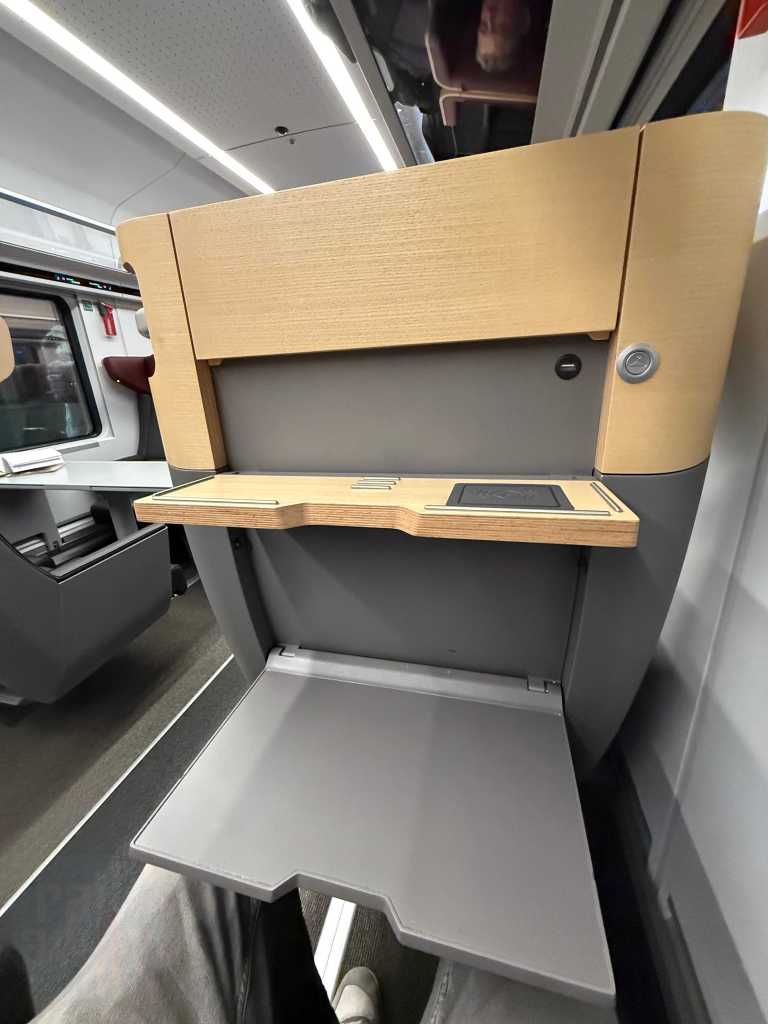 As is the case with Economy Class, there are two fold-down tables provided at airline-style seating. There is a traditional large table that can comfortably take a laptop and an innovative smaller table at eye level that has a wireless phone charger and groves to support a phone or tablet standing up to watch videos.