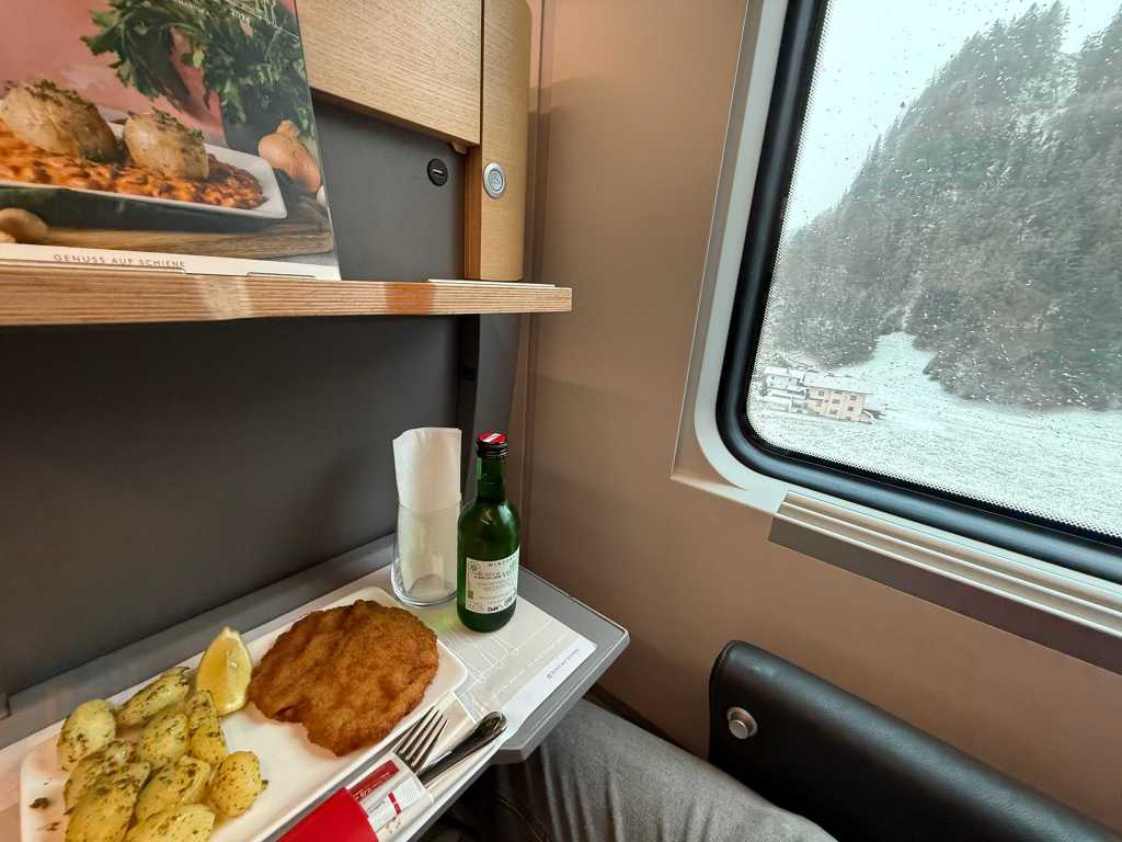 Lunch time for me on the RailJet 81 was perfectly timed with the snowy climb of the Brenner Pass. I opted for Wiener schnitzel washed down with a dry, fruity Grüner Veltliner white wine while enjoying the views. This was followed by a tasty, warm apple strudel with vanilla sauce. Unbeatable experience at a reasonable price for a train. The latest menu can be found online here.