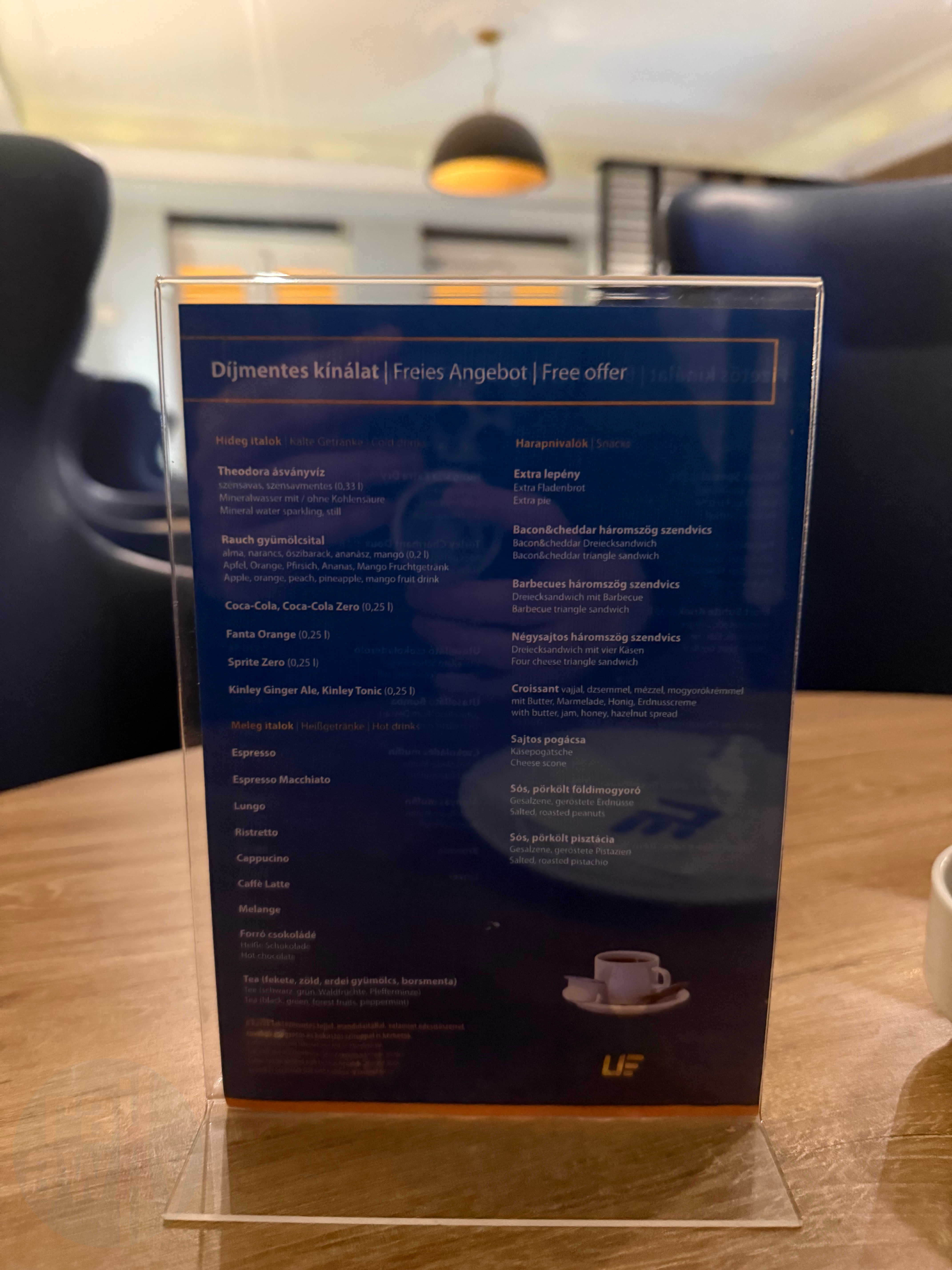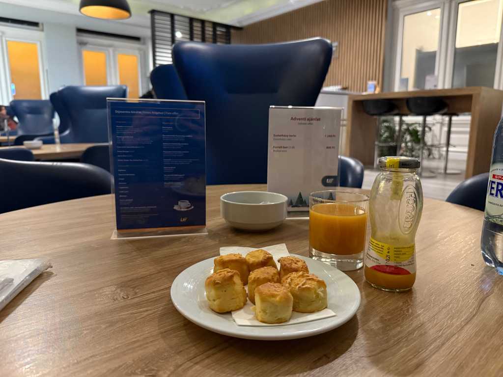 As it happened, I was the only patron in the lounge, operated by MรV’s catering partner Utasellรกtรณ, and I was outnumbered by the three staff. This did mean I was served straightaway which was nice. The lounge offers a free and paid-for offering (see the menus below), including sandwiches, snacks and drinks.