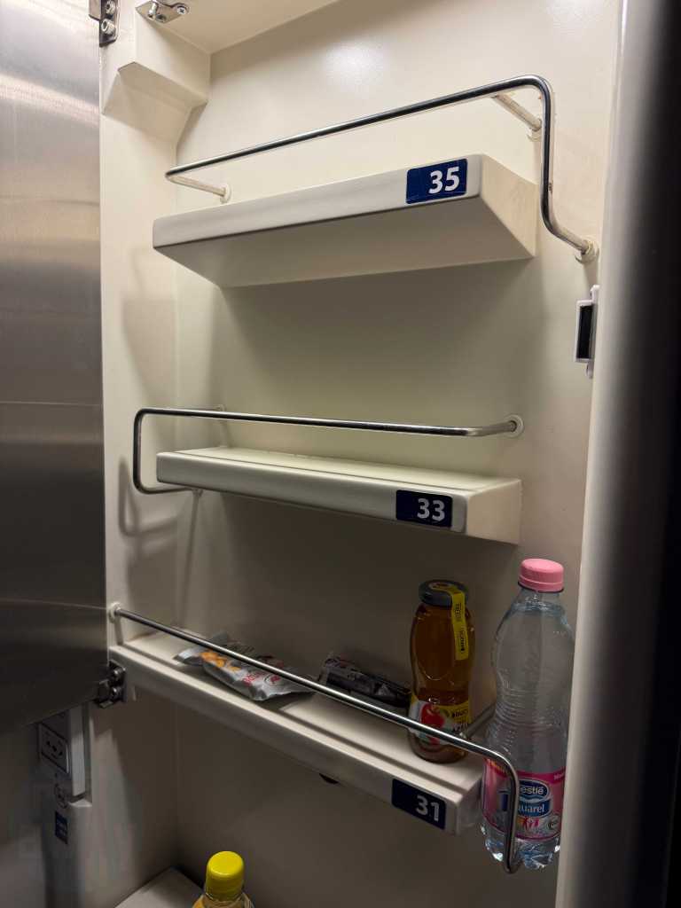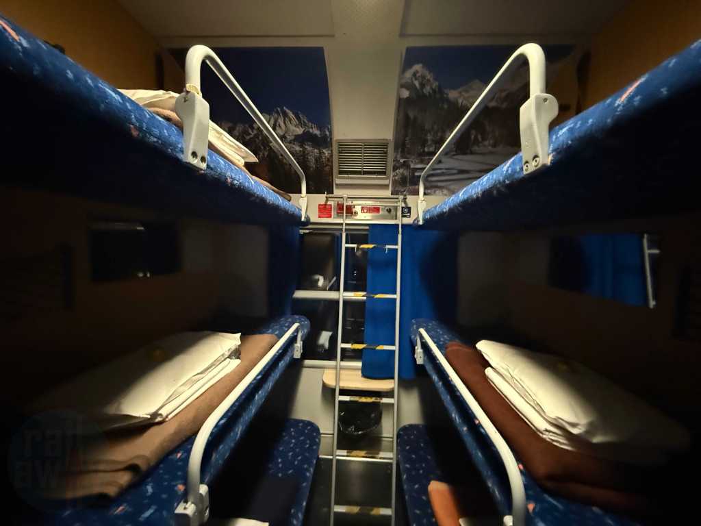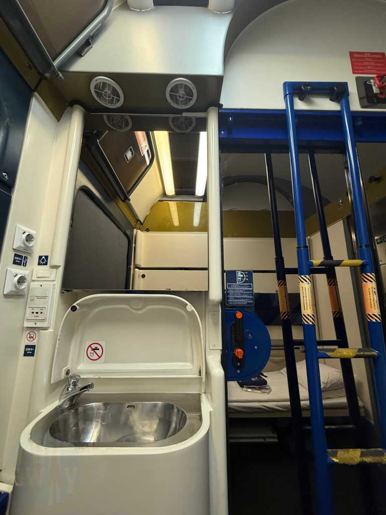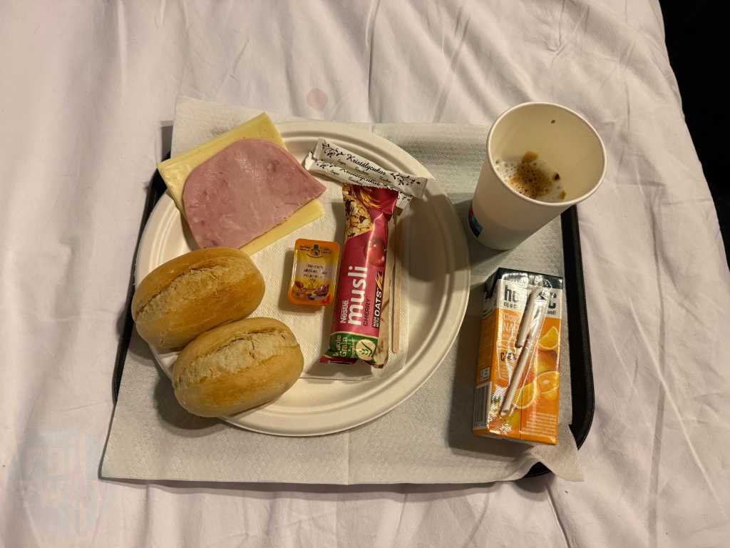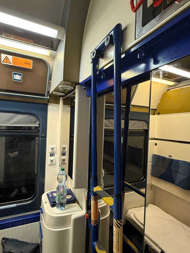 The air-conditioned compartment featured a washbasin, a small towel, a bar of soap, power sockets and a breakfast menu card. The host was about to collect the latter. There was also a redundant ladder for accessing the upper berths, as well as a cupboard with some departure treats – including a bottle of water and a juice. There was supposed to be, in NightJet style, a small bottle of sparkling wine, however that wasn’t offered on this occassion. It’s worth mentioning that unlike the NightJet, there are no useable showers onboard this train.