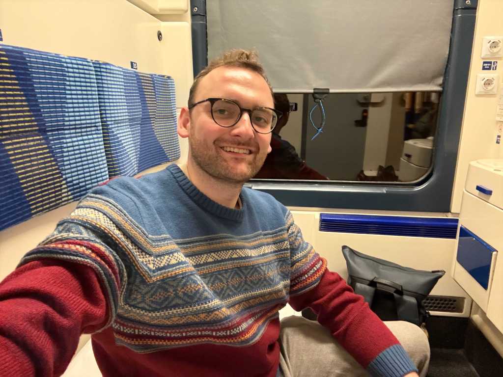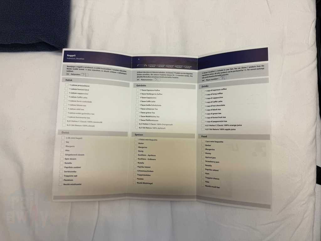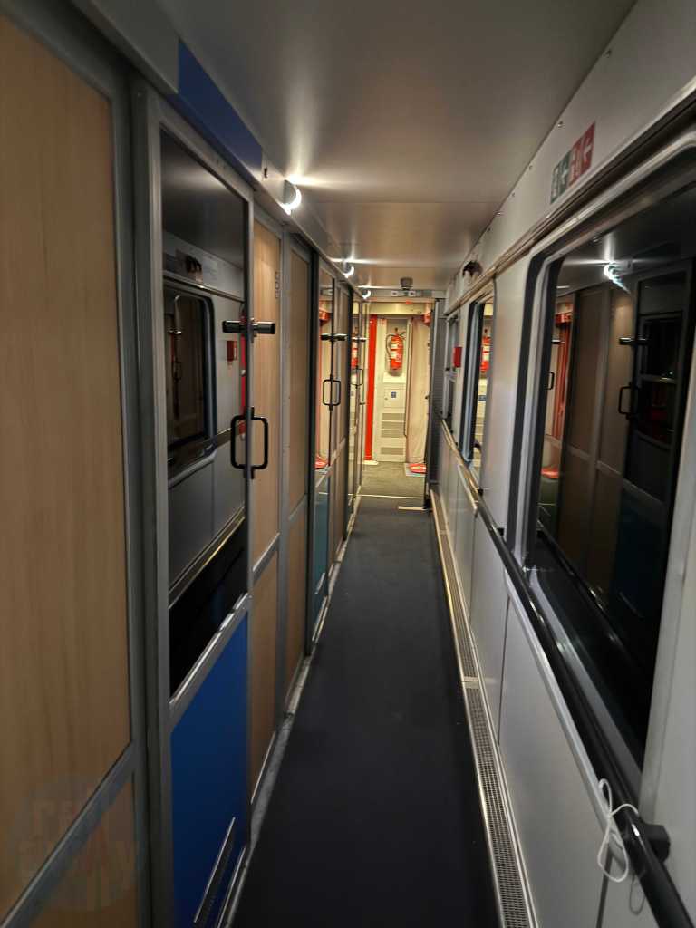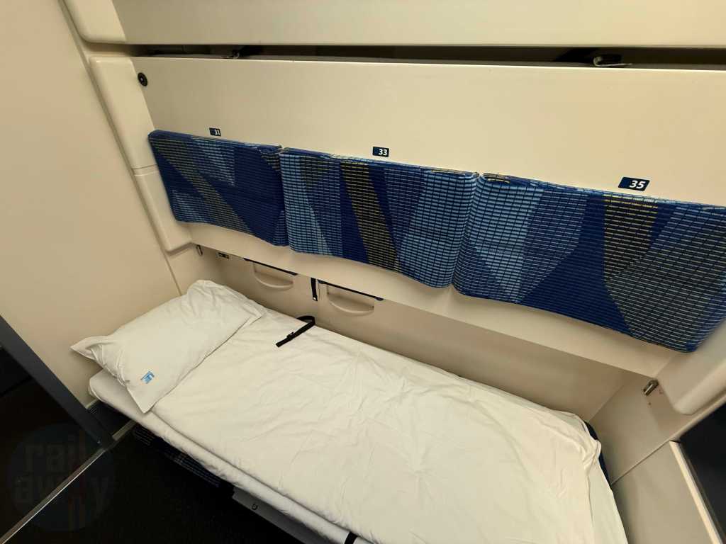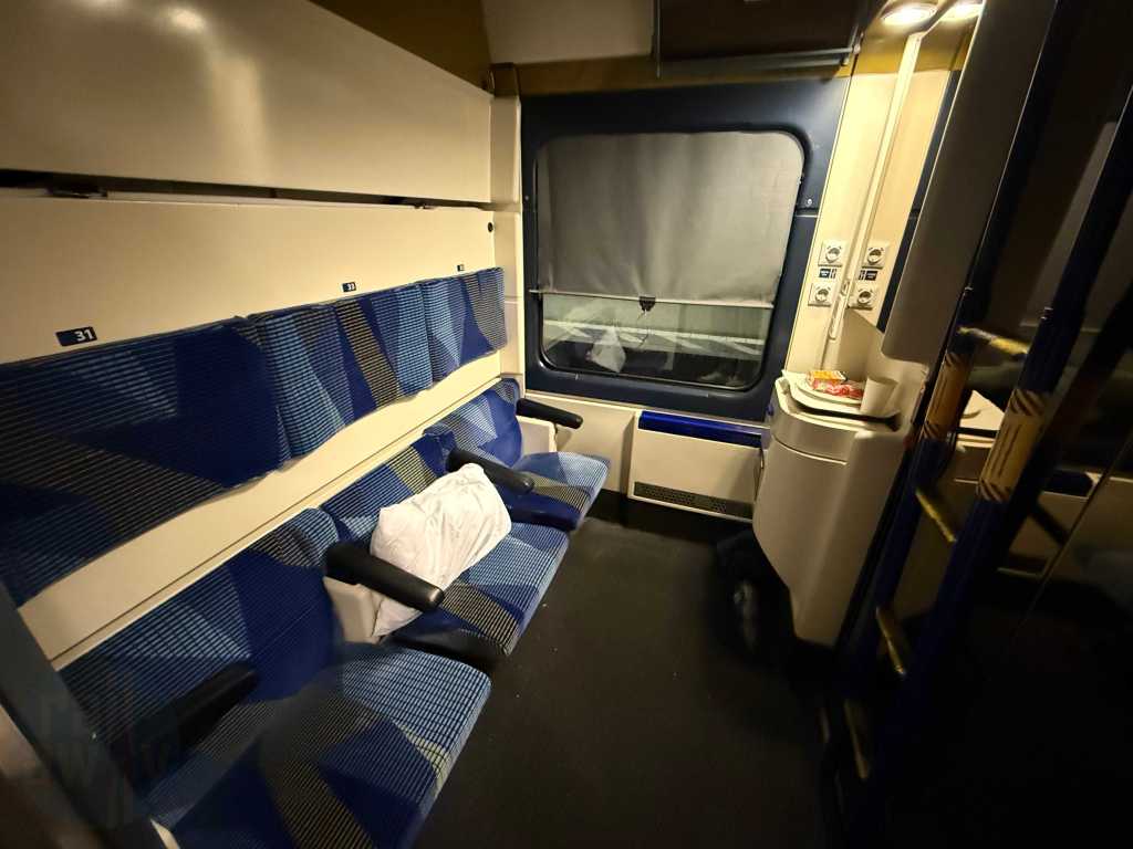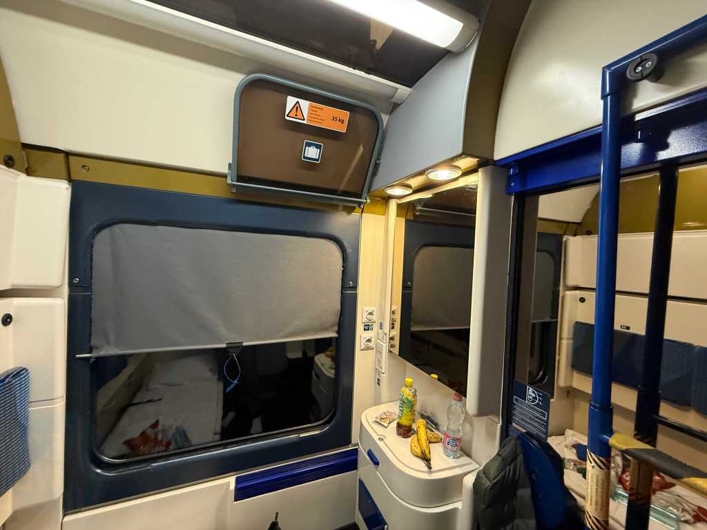 The air-conditioned compartment featured a washbasin, a small towel, a bar of soap, power sockets and a breakfast menu card. The host was about to collect the latter. There was also a redundant ladder for accessing the upper berths, as well as a cupboard with some departure treats – including a bottle of water and a juice. There was supposed to be, in NightJet style, a small bottle of sparkling wine, however that wasn’t offered on this occassion. It’s worth mentioning that unlike the NightJet, there are no useable showers onboard this train.