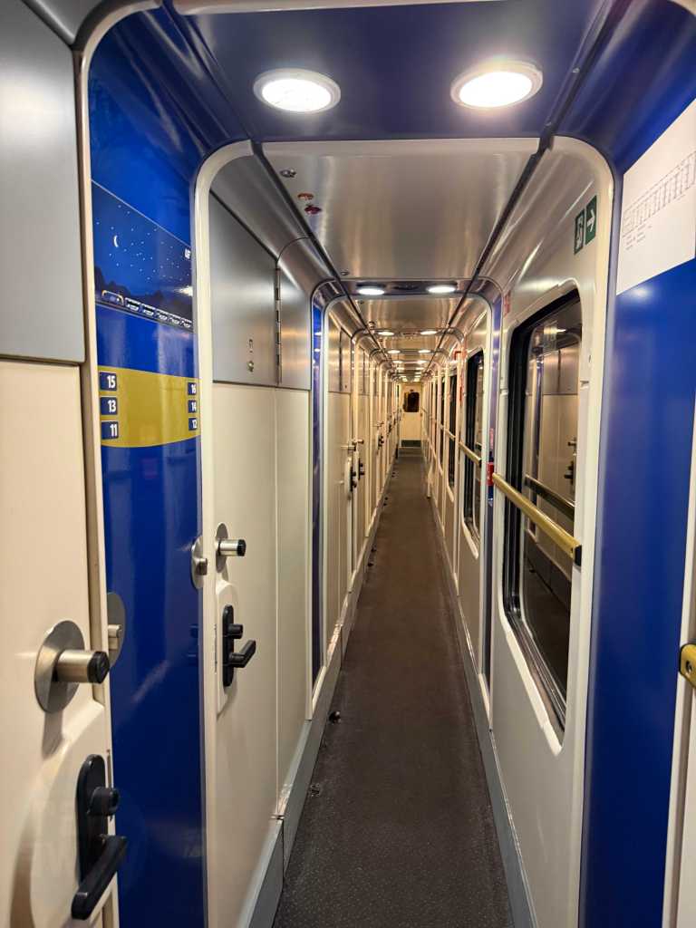 The most premium accommodation on the EuroNight ‘Kรกlmรกn Imre’ is the sleeping car. Each sleeping car contains eleven compartments with three beds in each. On this trip I had a private compartment, booking solo occupancy – an option for an additional charge upon booking.